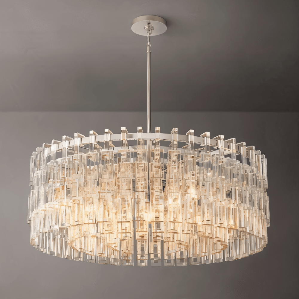 Its layered design features hundreds of faceted crystal bars that catch and refract light, producing a radiant, shimmering glow across the room.