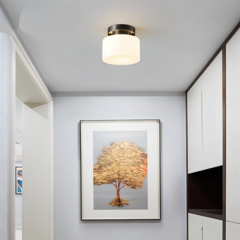 The Zilt ceiling light is a sleek, modern light fixture featuring a cylindrical frosted glass shade and a durable copper base. Its minimalist design blends seamlessly with contemporary, industrial, and transitional interiors, making it ideal for hallways, bedrooms, and entryways. The frosted glass diffuses light evenly, reducing glare and creating a soft, ambient glow.