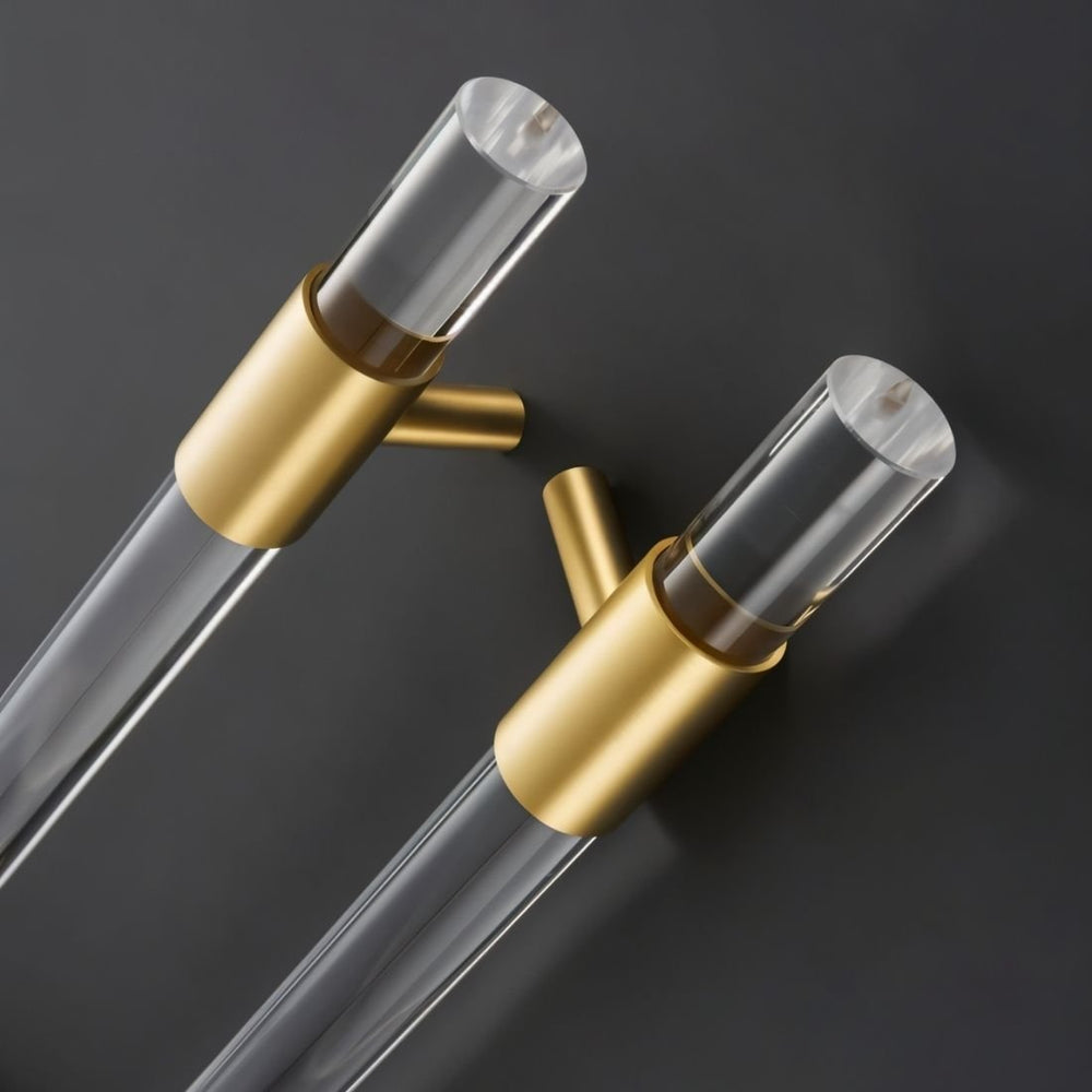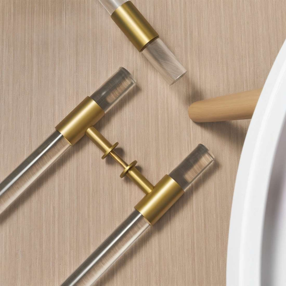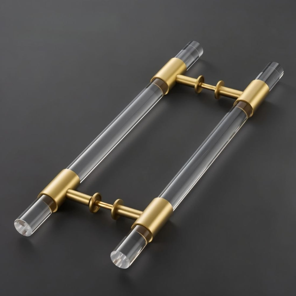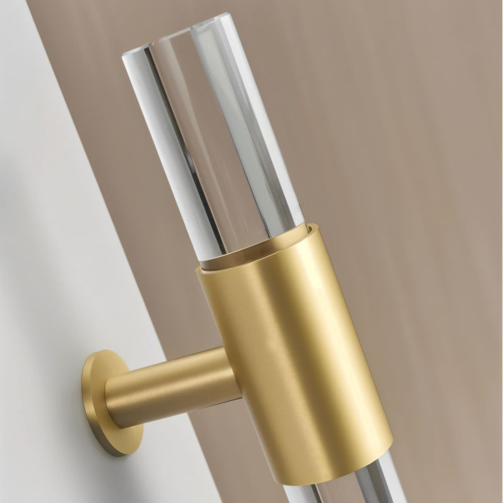 The Zuhin is a double-sided pull crafted from acrylic and brass, offering a sleek and modern aesthetic. Its symmetrical design provides versatility in installation, while the smooth acrylic surface and brass accents create a comfortable grip and elegant touch.