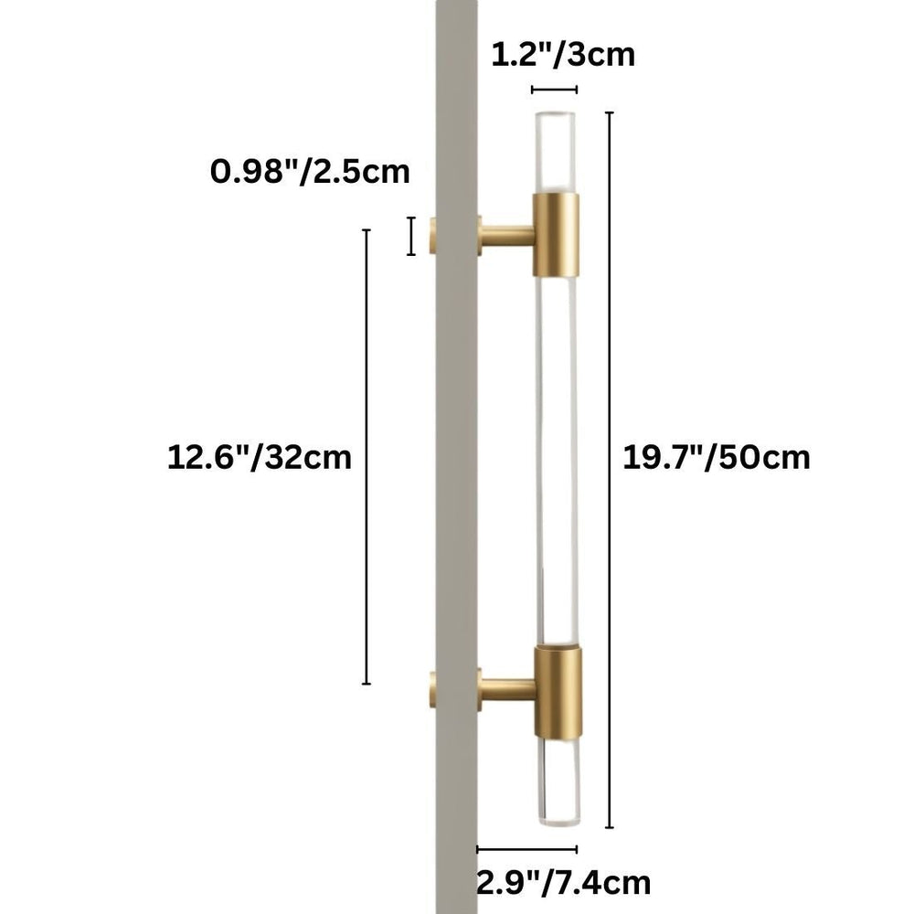 Dimensions: 2.9" x 19.7" / 7.4 x 50cm Hole Spacing: Hole to Hole: 12.6" / 32cm Material: Brass, Acrylic Finish: Brass, Clear Weight: 715g, 1.4kg Grip Style: Smooth Application: Doors