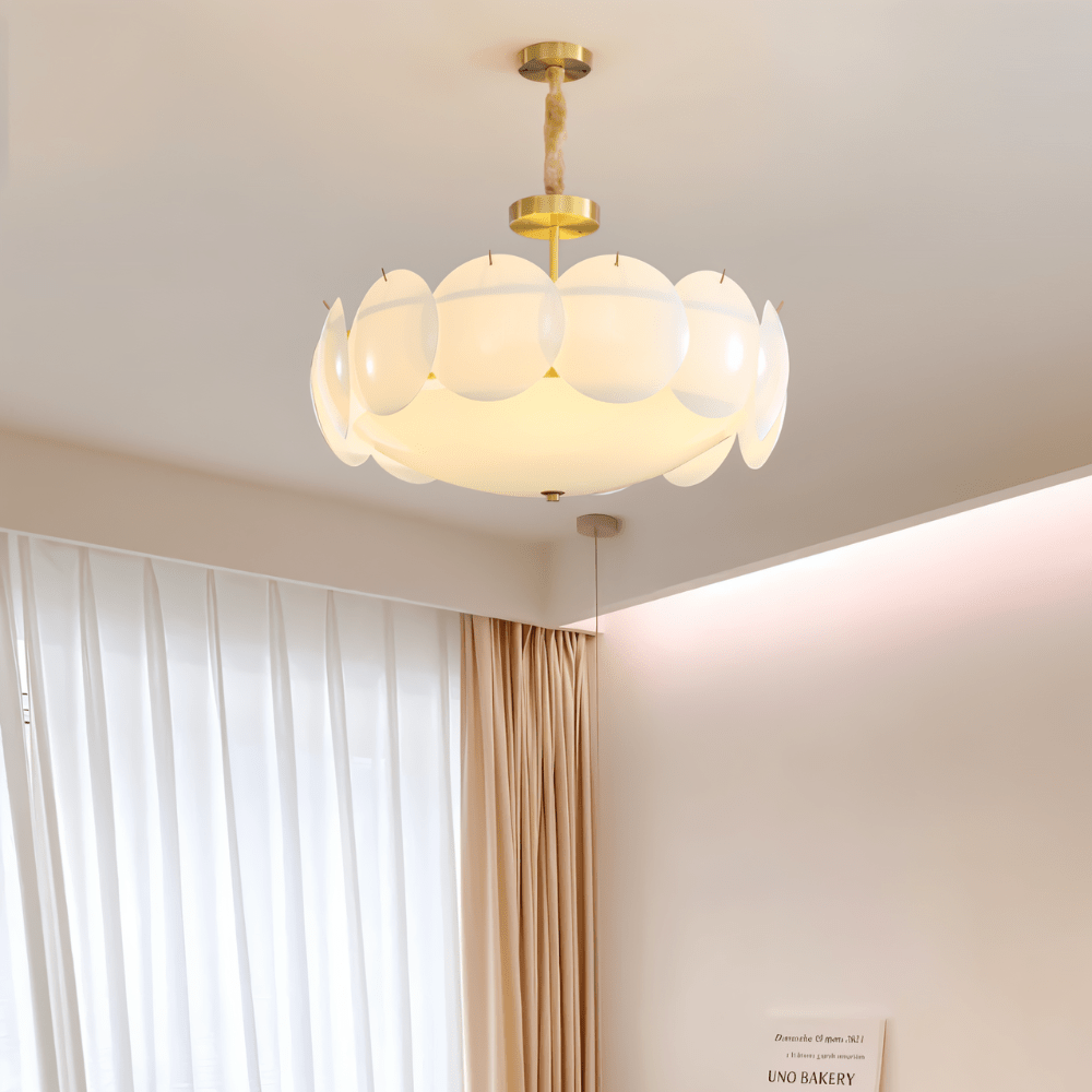 The Zuvin Chandelier is a sculptural light fixture crafted from copper with a frosted glass lampshade arranged in a scalloped circular design. Its layered petal-like glass panels diffuse light evenly, casting a warm ambient glow ideal for modern living rooms, bedrooms, or boutique dining spaces. The elegant brass ceiling mount and central rod add a contemporary metallic accent. This ceiling-mounted light fixture balances organic form with luxury detailing.
