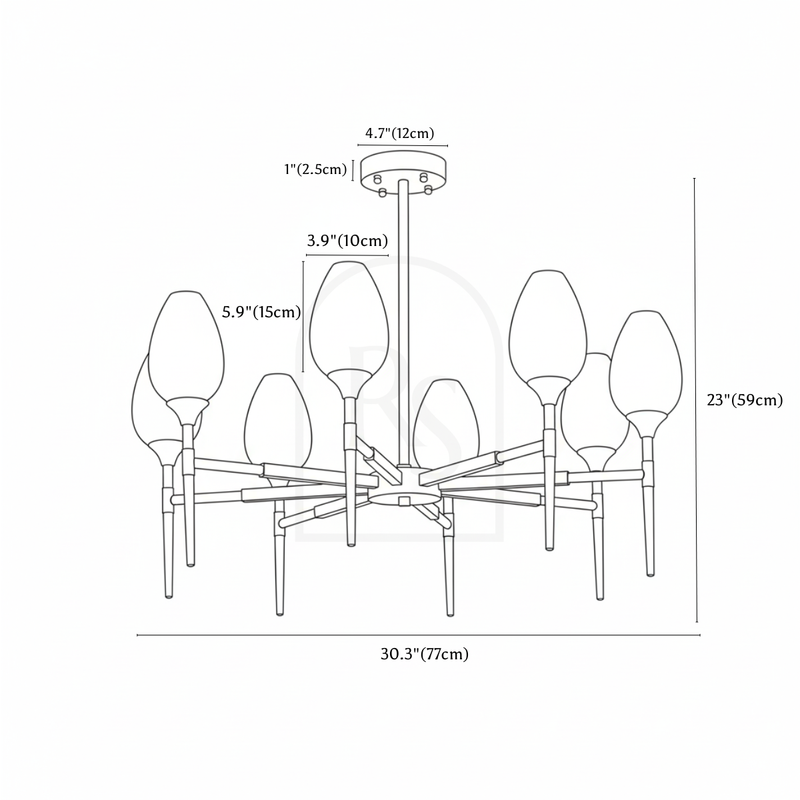 The Zylin Chandelier is a striking light fixture crafted from premium copper and complemented by elegant glass lampshades. Its design features sleek, tulip-inspired shades and a refined golden finish that brings a touch of modern luxury to any space. It offers versatile styling options to suit bedrooms, dining rooms, or living areas. The sophisticated structure blends artful geometry with warm ambient lighting, creating a statement centerpiece. This light fixture seamlessly combines contemporary aesthetics with timeless elegance for upscale interiors.