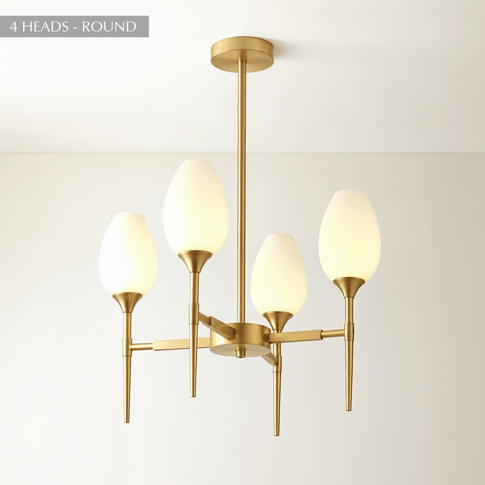 Its tulip-inspired glass shades, premium copper build, and refined golden finish create a stunning combination of contemporary luxury and timeless elegance.
