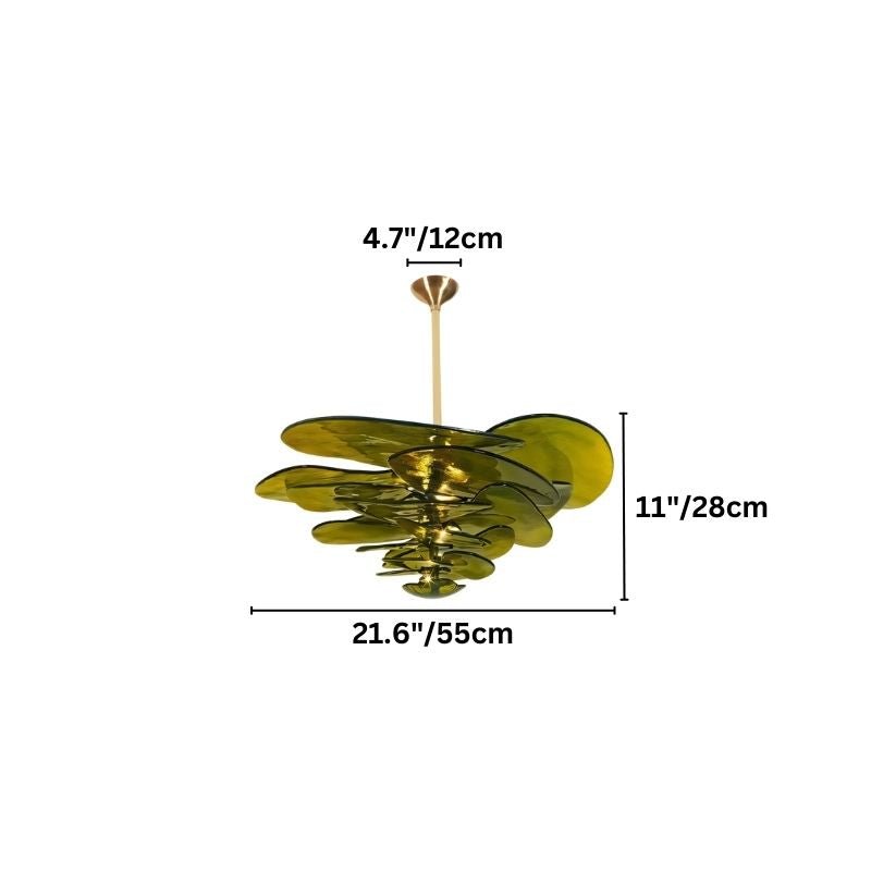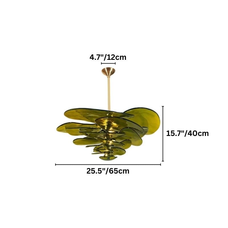 The Aerlis Chandelier is a statement light fixture crafted from Murano glass and metal, featuring layered, translucent green glass petals for an organic, nature-inspired aesthetic. The gold-toned metal accents enhance its luxurious appeal. Available in four sizes and colors, it suits dining rooms, living spaces, and entryways. This ceiling-mounted chandelier provides ambient lighting while serving as a striking décor element.