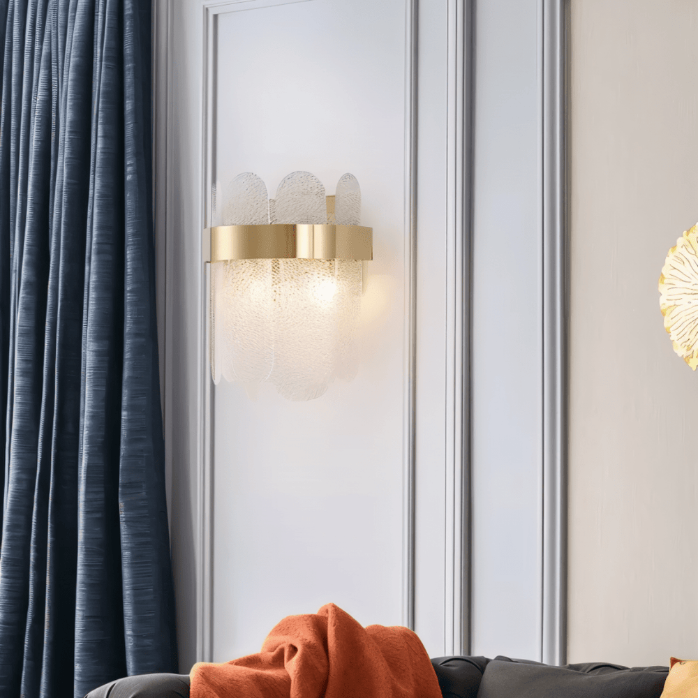Ailine Wall Lamp is a contemporary light fixture crafted from glass and stainless steel, designed to elevate modern interiors with its refined elegance. The lamp features overlapping smoked glass panels encased in a sleek golden stainless-steel frame, creating a layered, dimensional look that diffuses light beautifully. Perfect for hallways, bedrooms, or living areas, this light fixture combines modern geometry with luxurious materials, offering both functional illumination and decorative sophistication.