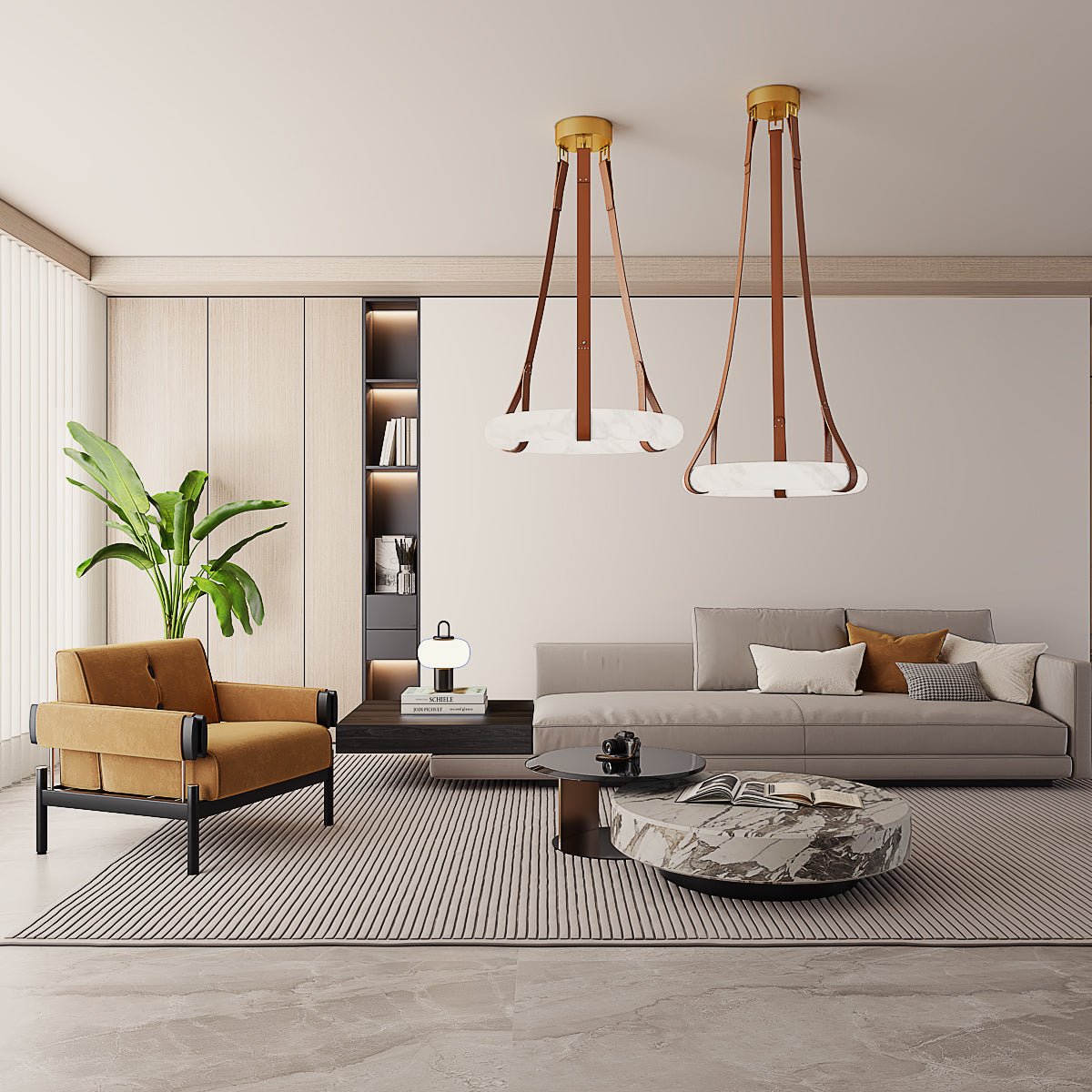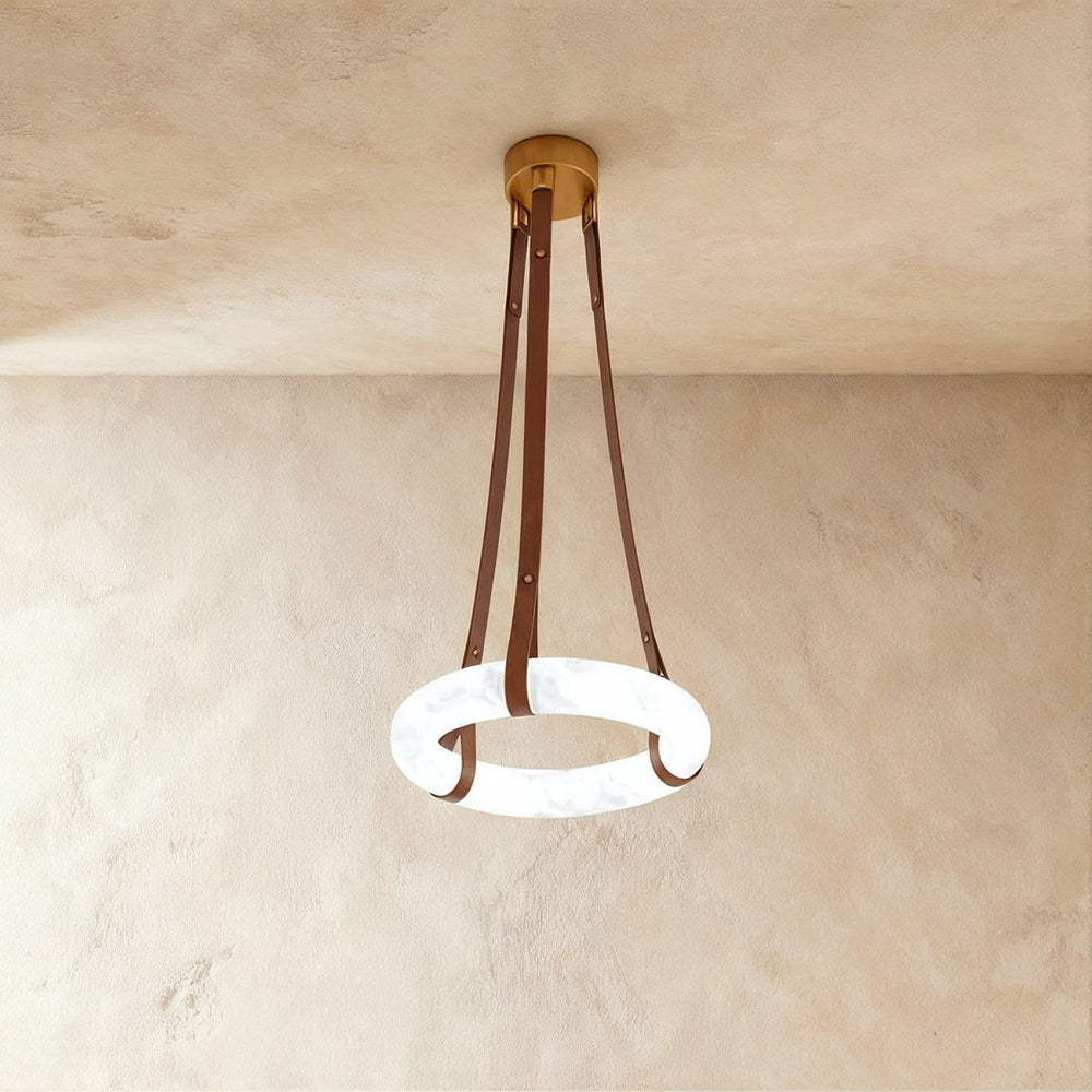 The Aktis Alabaster Pendant Light, a captivating pendant fixture, will add a touch of elegance to your space. It emits a luminous halo effect and is made of alabaster rings and adjustable leather straps in your choice of colors. This unique and modern chandelier would make a stunning statement over a dining table, living room and bedrooms.