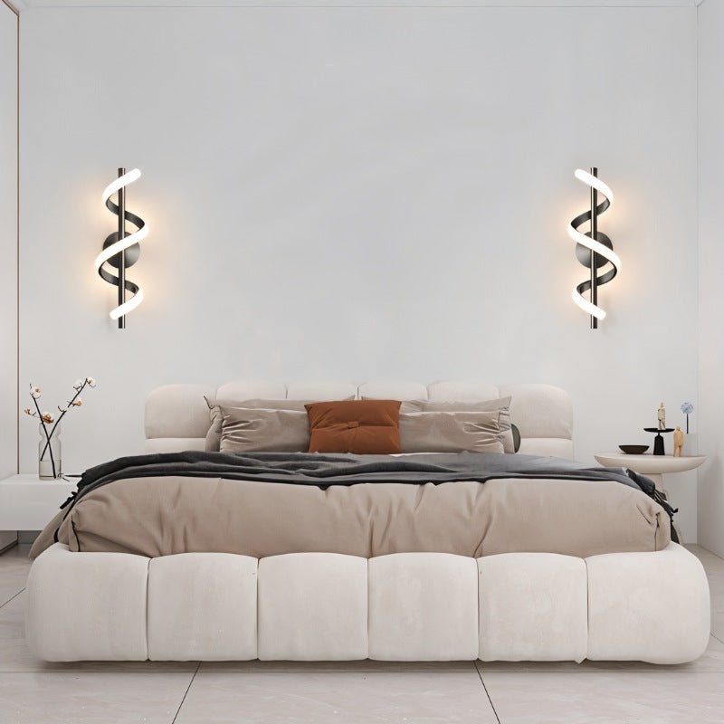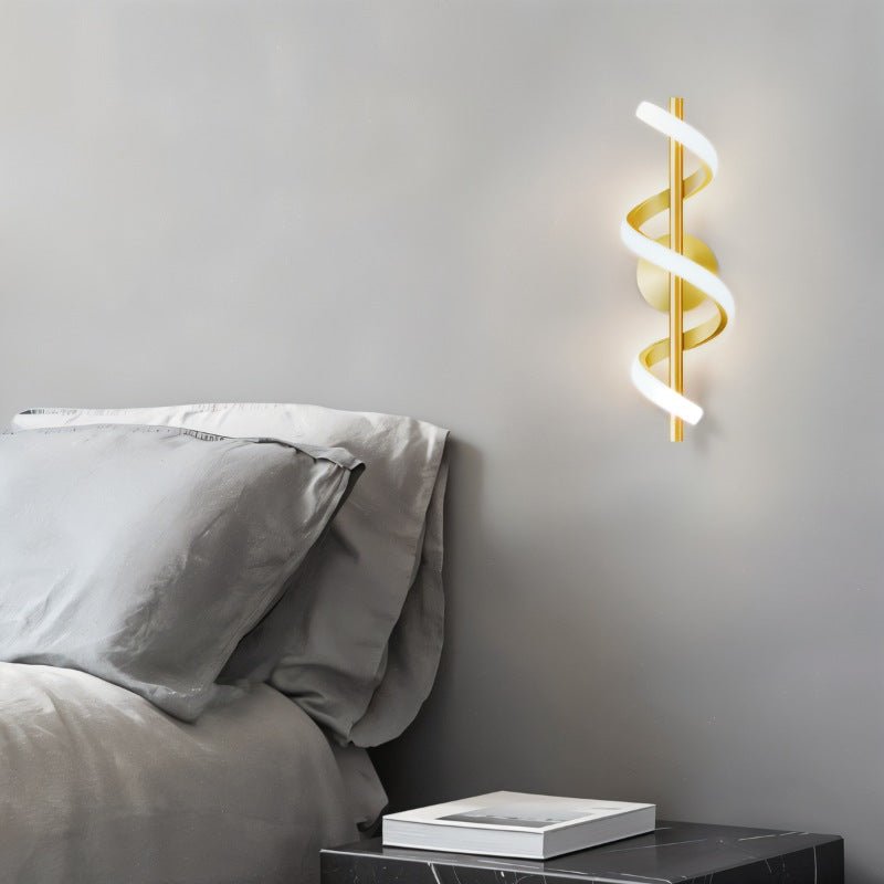 The Alina Wall Lamp seamlessly integrates with modern decor through its contemporary spiral design and finishes in gold, black, and white, offering a versatile and stylish lighting solution that complements various interior styles.