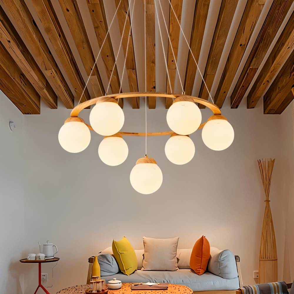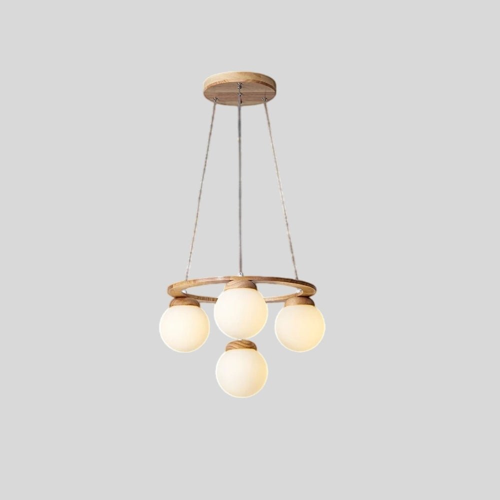 The Alyn chandelier features a refined light fixture with a circular wood frame supporting frosted glass globes. Suspended by sleek cables, its balanced design creates a floating effect, enhancing modern and contemporary interiors. The natural wood adds warmth, while the soft glow from the glass globes provides inviting illumination. Perfect for dining rooms, kitchens, and living spaces, this chandelier blends organic materials with modern geometry, making it a striking focal point.