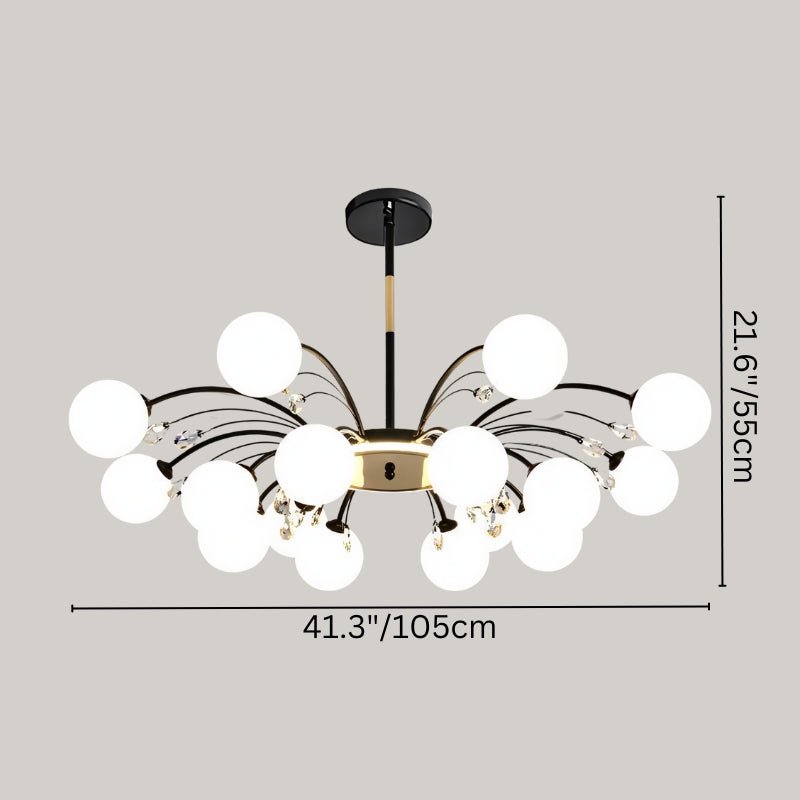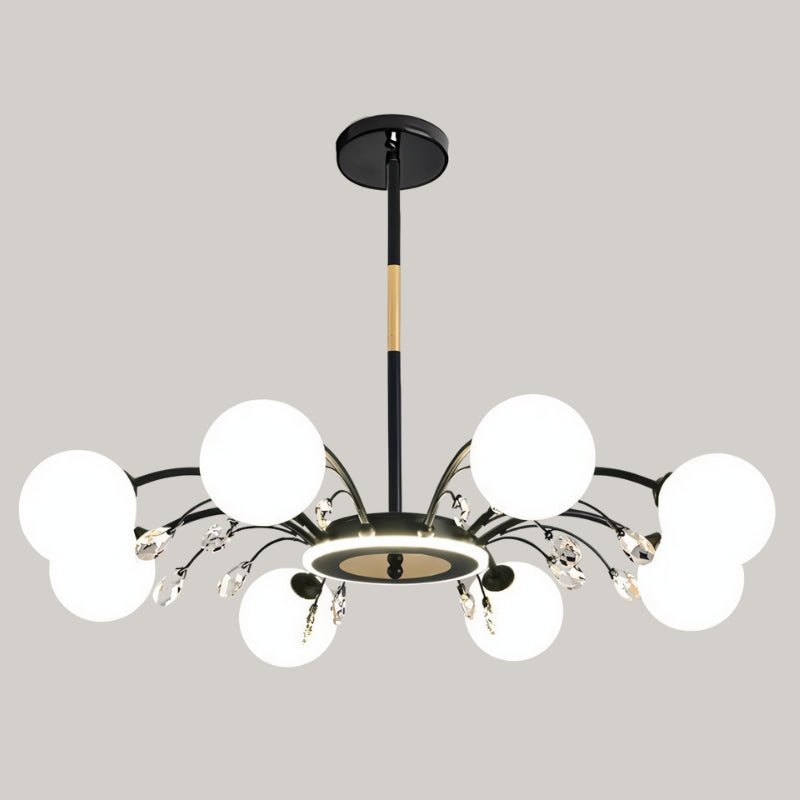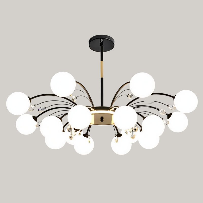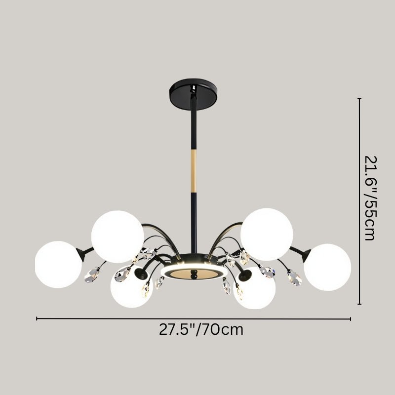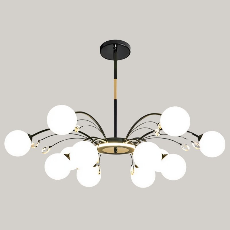 The Aneir Chandelier is a striking light fixture made from iron and glass, featuring gracefully curved metal arms adorned with frosted glass globes and crystal accents. Its radiant multi-light design creates a balanced, sculptural form, perfect for dining rooms, living areas, and high ceilings. This light fixture provides ample ambient lighting while enhancing interiors with a refined, contemporary aesthetic.