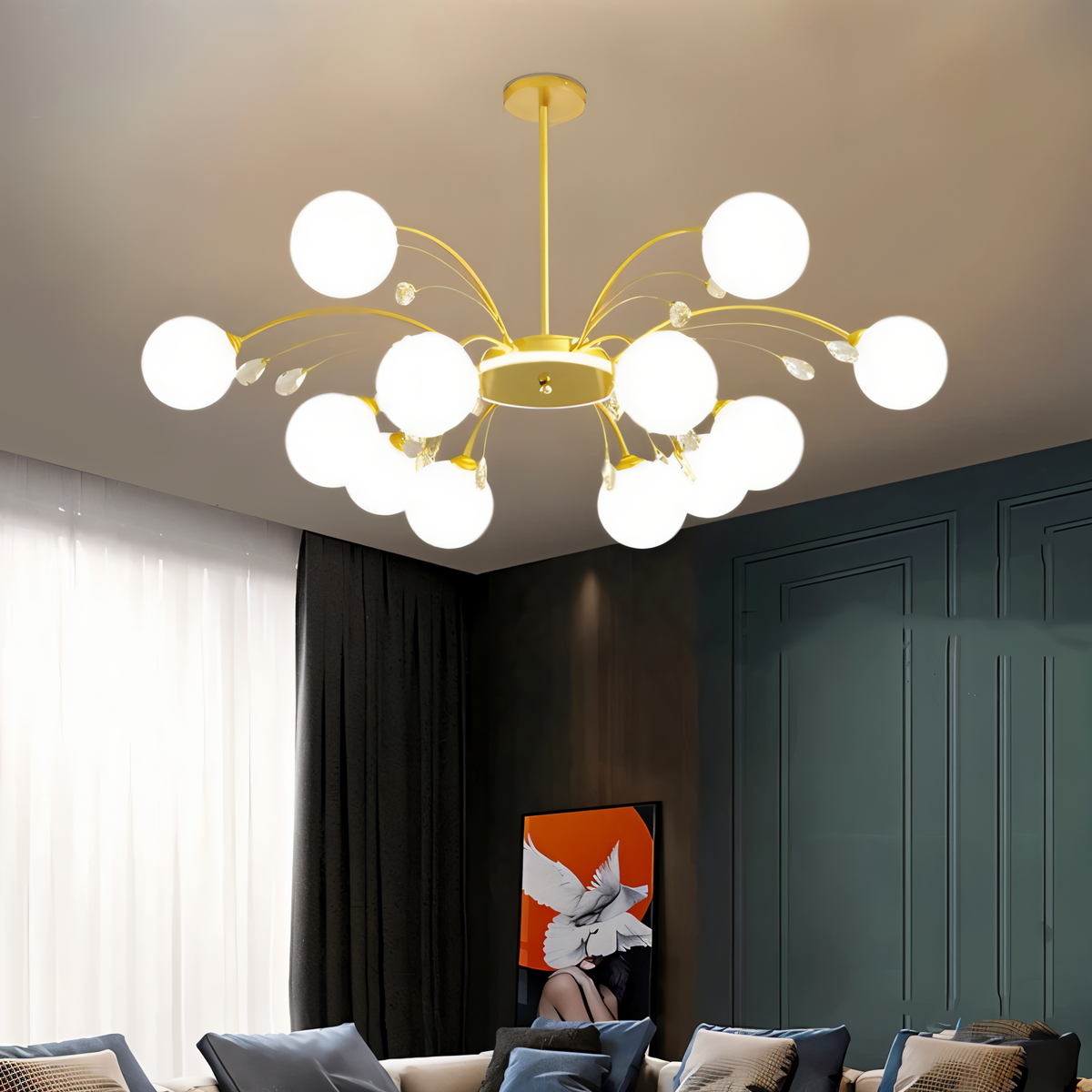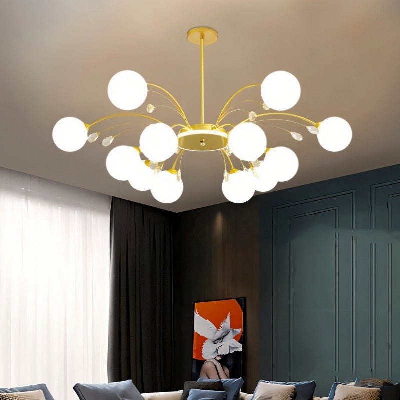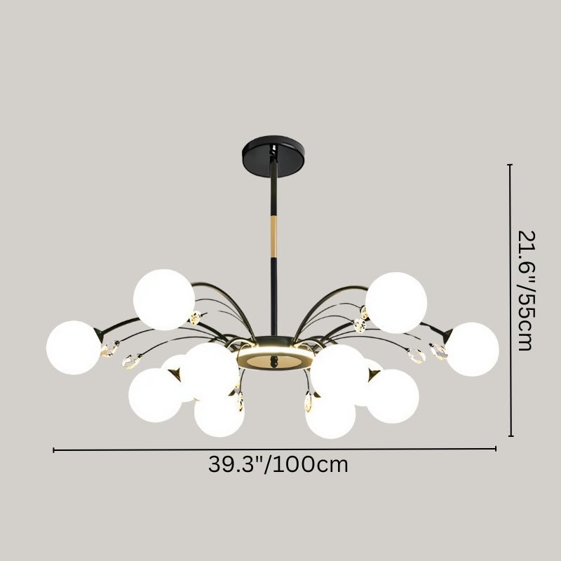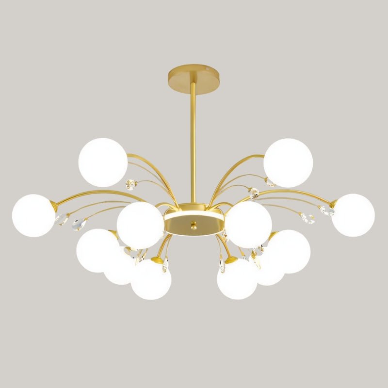 The Aneir Chandelier is a striking light fixture made from iron and glass, featuring gracefully curved metal arms adorned with frosted glass globes and crystal accents. Its radiant multi-light design creates a balanced, sculptural form, perfect for dining rooms, living areas, and high ceilings. This light fixture provides ample ambient lighting while enhancing interiors with a refined, contemporary aesthetic.