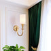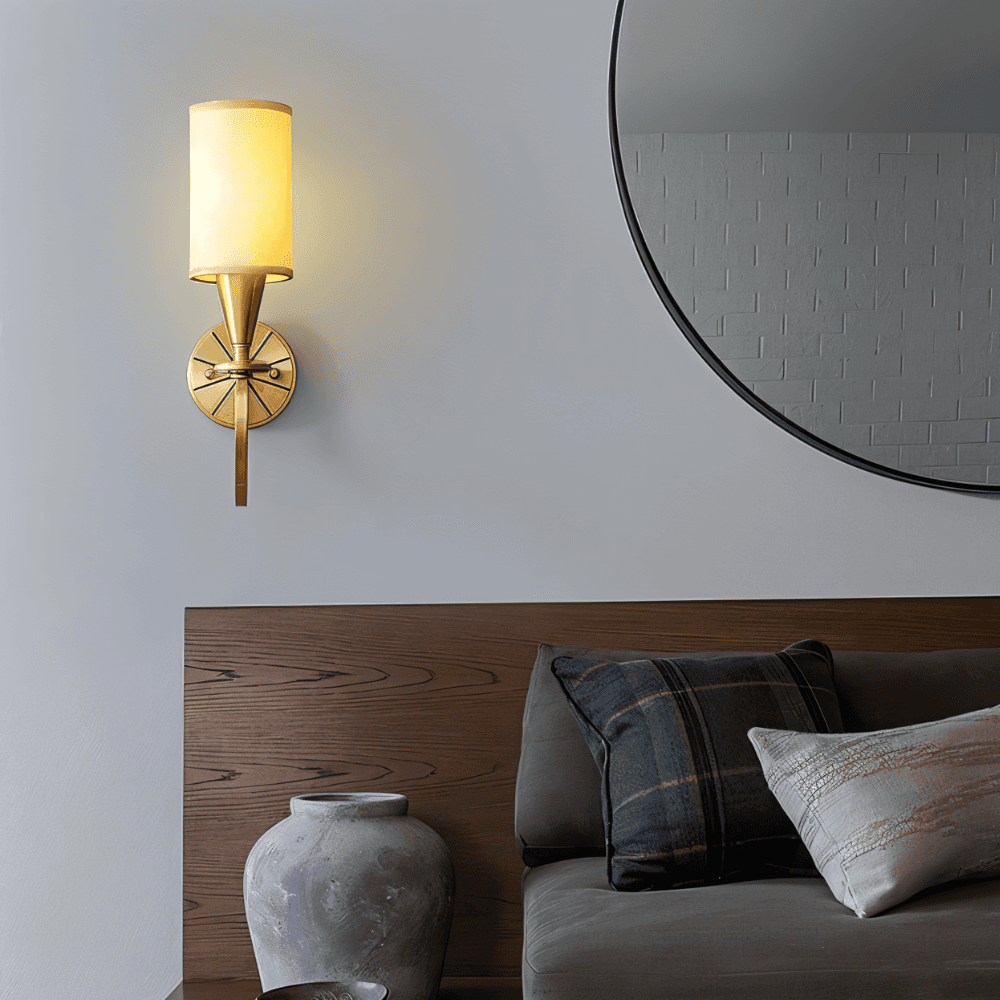 The Areso Wall Lamp is a sleek, wall-mounted light fixture that combines a cylindrical cloth lampshade with a brushed copper base for a refined, modern-classic look. The U-shaped arm and round backplate emphasize symmetry and elegance, making it ideal for accent lighting in hallways, bedrooms, or living areas. This light fixture delivers warm, ambient illumination and integrates seamlessly with both contemporary and transitional interiors. Crafted from copper and topped with a fabric shade, it balances durability with visual softness.