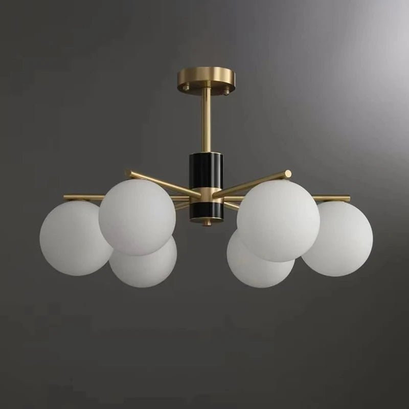 The Ascen chandelier is made of strong metal and acrylic. It has a stylish and modern design with round, globe-shaped shades. These shades give off a soft and warm light, making the room feel cozy. The chandelier is perfect for dining rooms, living rooms, or entryways, providing both light and a beautiful look. Its design is simple yet elegant, with a central rod and extending arms holding the globe shades evenly.