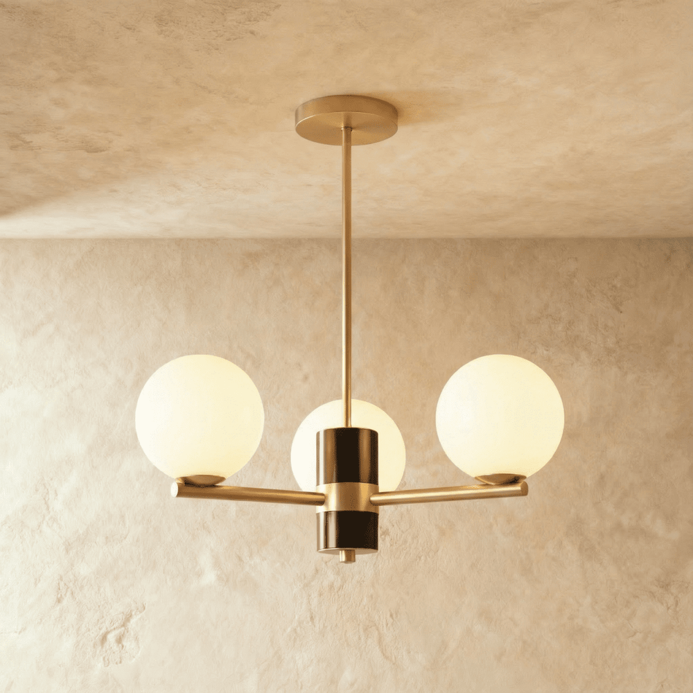 The Ascen chandelier is made of strong metal and acrylic. It has a stylish and modern design with round, globe-shaped shades. These shades give off a soft and warm light, making the room feel cozy. The chandelier is perfect for dining rooms, living rooms, or entryways, providing both light and a beautiful look. Its design is simple yet elegant, with a central rod and extending arms holding the globe shades evenly.
