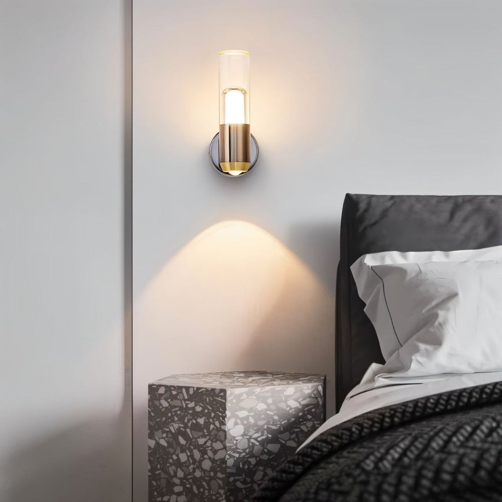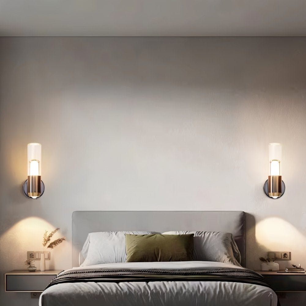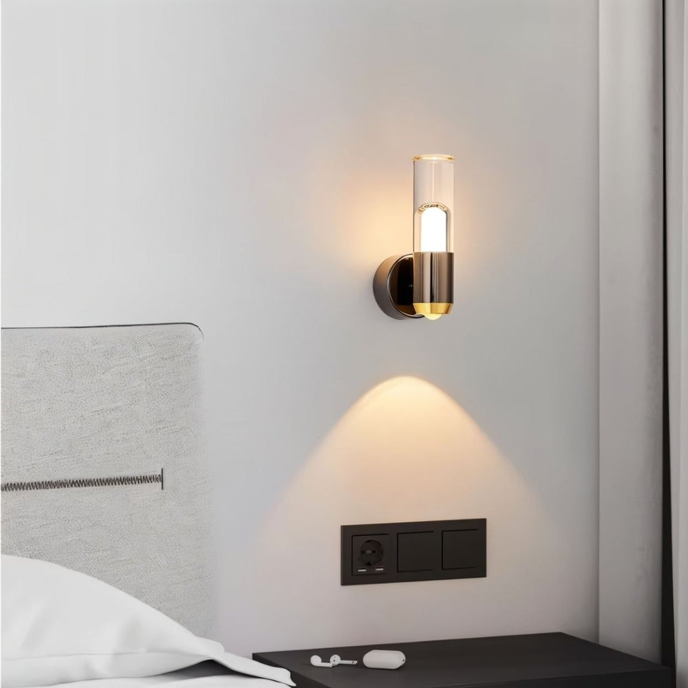The Aspen Wall Lamp features a sleek cylindrical design with a metal base and an acrylic diffuser, casting a warm, ambient glow. Its modern black and gold finish adds elegance, making it perfect for bedrooms, hallways, and living spaces. This minimalist fixture blends seamlessly with contemporary and luxury interiors.