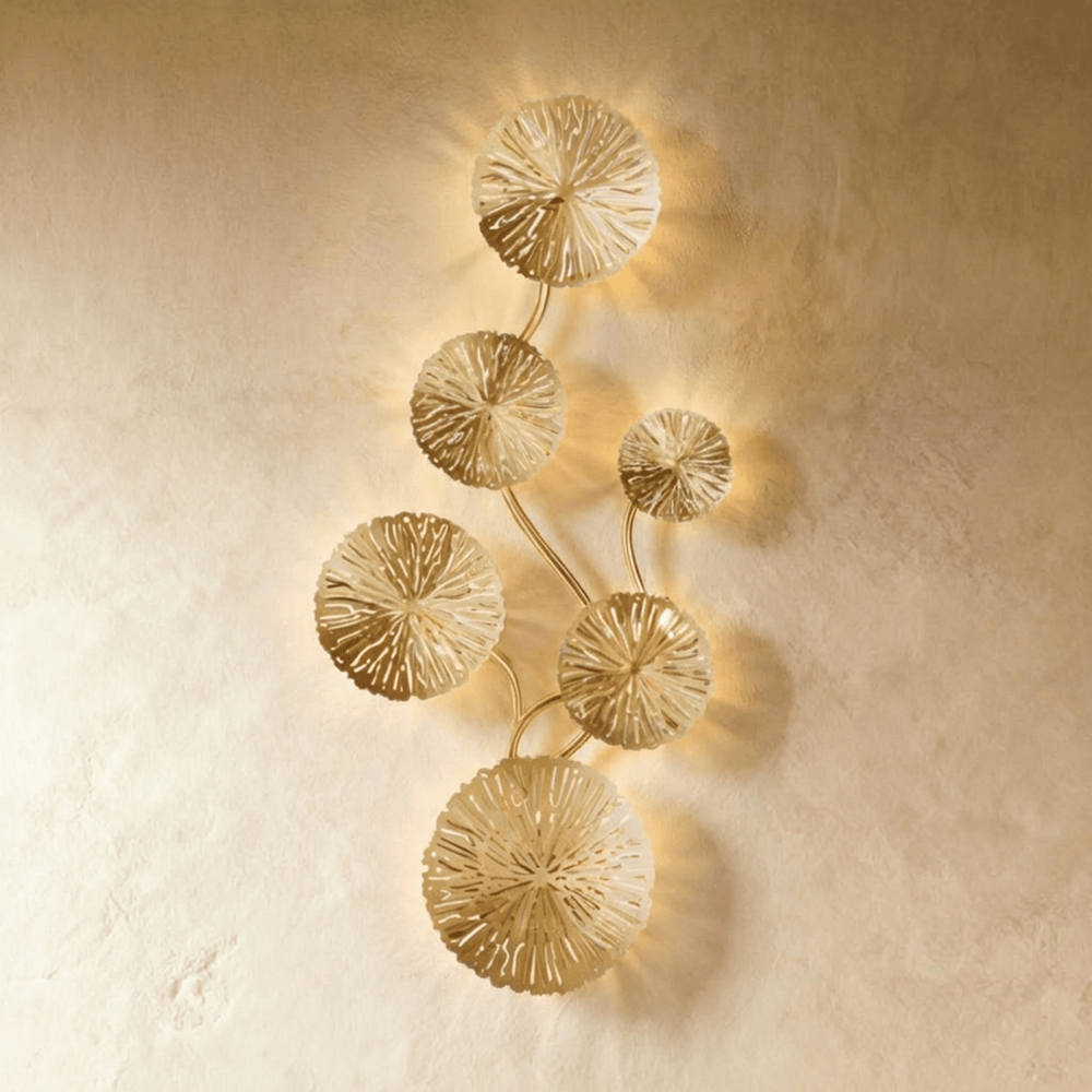 The Aurelia Illuminated Art is a sophisticated and versatile lighting solution that combines functionality with aesthetic appeal, making it an ideal choice for those looking to enhance their space with a celestial glow. This art piece is meticulously crafted from durable, high-quality metal and finished in an elegant gold tone that adds a touch of timeless grandeur to any room. It features a 2-in-1 design that serves both as a lamp and a decorative wall piece, equipped with energy-saving LED lights in a warm color to create a cozy and inviting atmosphere. The LEDs boast a long lifespan of 50,000 hours and operate on a voltage range of 90 - 260 volts, ensuring efficient and even lighting. Available in various sizes and configurations, the Aurelia can be installed in multiple settings such as bedrooms, dining rooms, and living areas, making it a versatile choice for both residential and commercial spaces. Its easy installation process and the ability to choose from different styles allow for customization to suit individual tastes and interior designs, further establishing its utility and charm as a premium lighting solution.