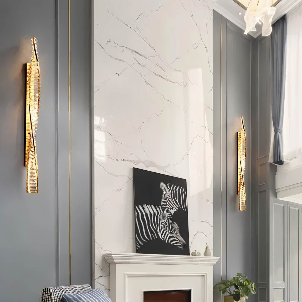 The Aurora Wall Lamp features a twisted vertical crystal design framed in polished metal, creating a dynamic sculptural effect that radiates modern elegance.
