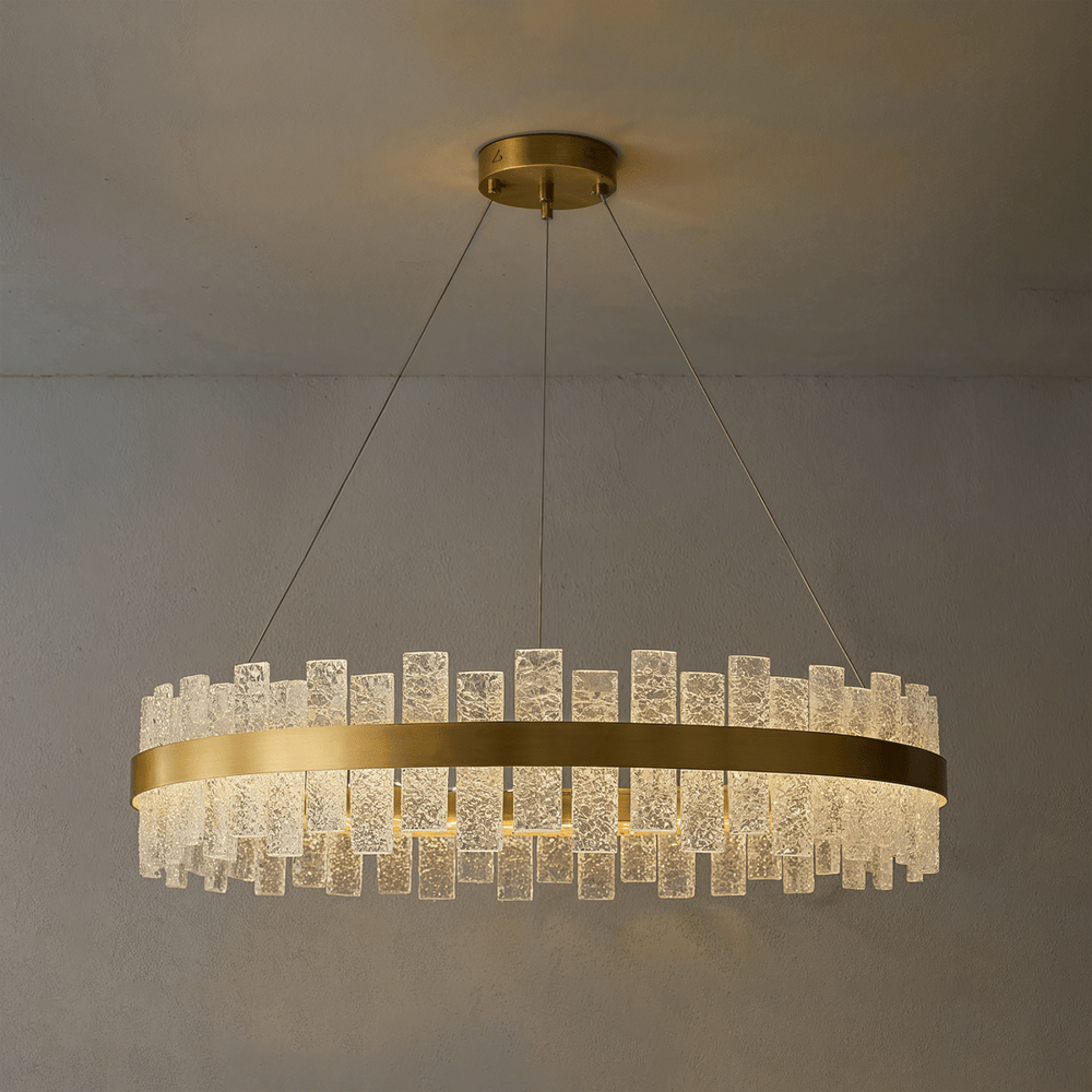 The Avis Chandelier is a refined light fixture crafted from copper and adorned with a textured glass lampshade, radiating both elegance and modernity. Its unique structure features staggered rectangular glass elements that create a crystalline illusion of depth and luminosity. Available in both linear and round configurations, the design supports installation over dining tables, kitchen islands, or entryways. Suspended by slender cables from a metallic ceiling canopy, it offers a visually striking yet balanced form. Ideal for upscale interiors seeking architectural lighting with sculptural presence.