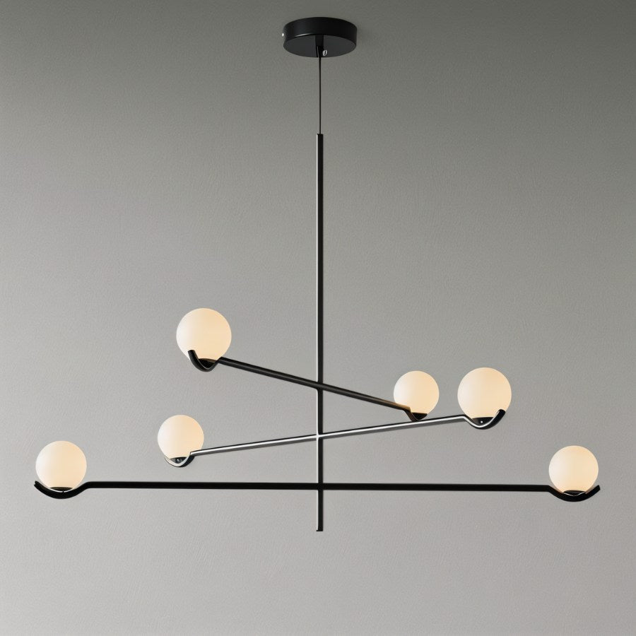 Modern geometric structure with slim iron rods and opal glass shades for timeless elegance.