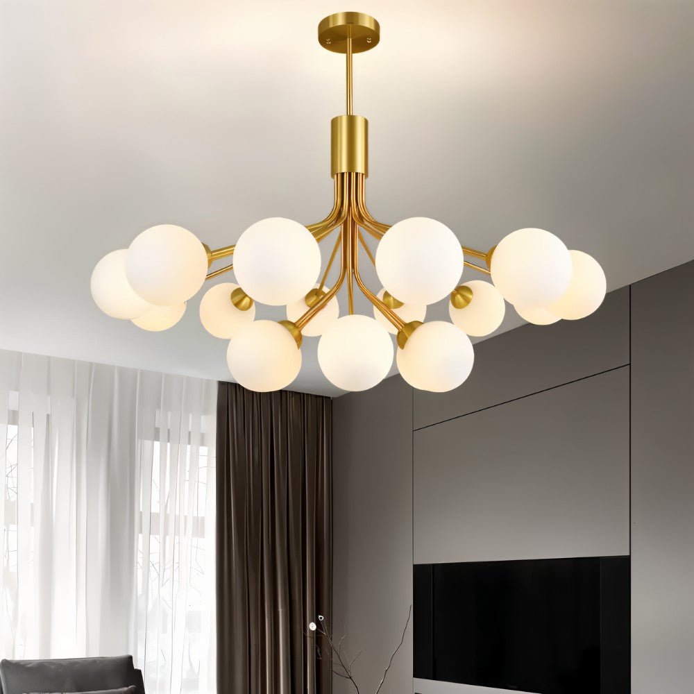 The Binal chandelier features a striking metal and glass light fixture with a symmetrical branching structure. Its opal glass globes emit a warm, diffused glow, creating a sophisticated ambiance. Designed for dining rooms, living spaces, and entryways, this chandelier adds depth with its sculptural form. The gold-finished metal frame enhances modern and mid-century interiors, making it a statement lighting piece.