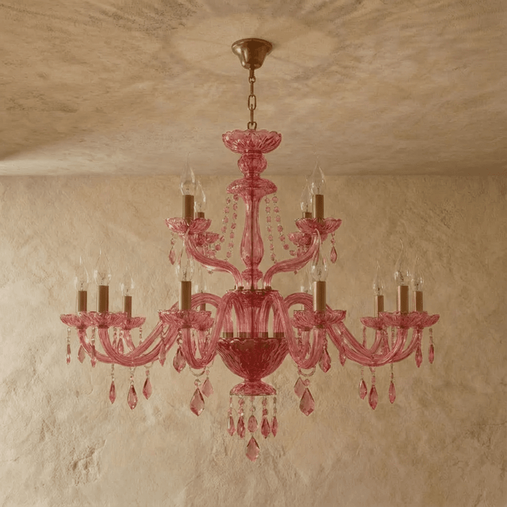 A vibrant pink chandelier that adds dramatic flair to luxurious interiors.