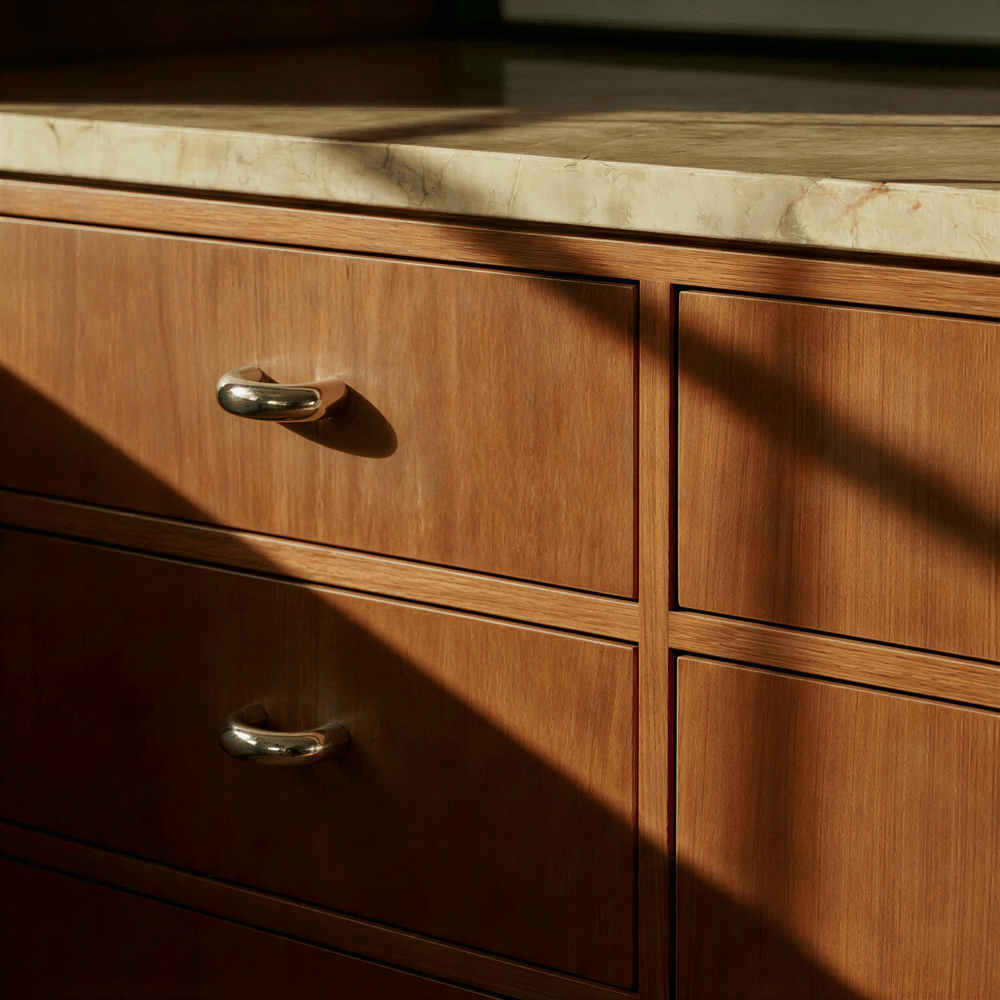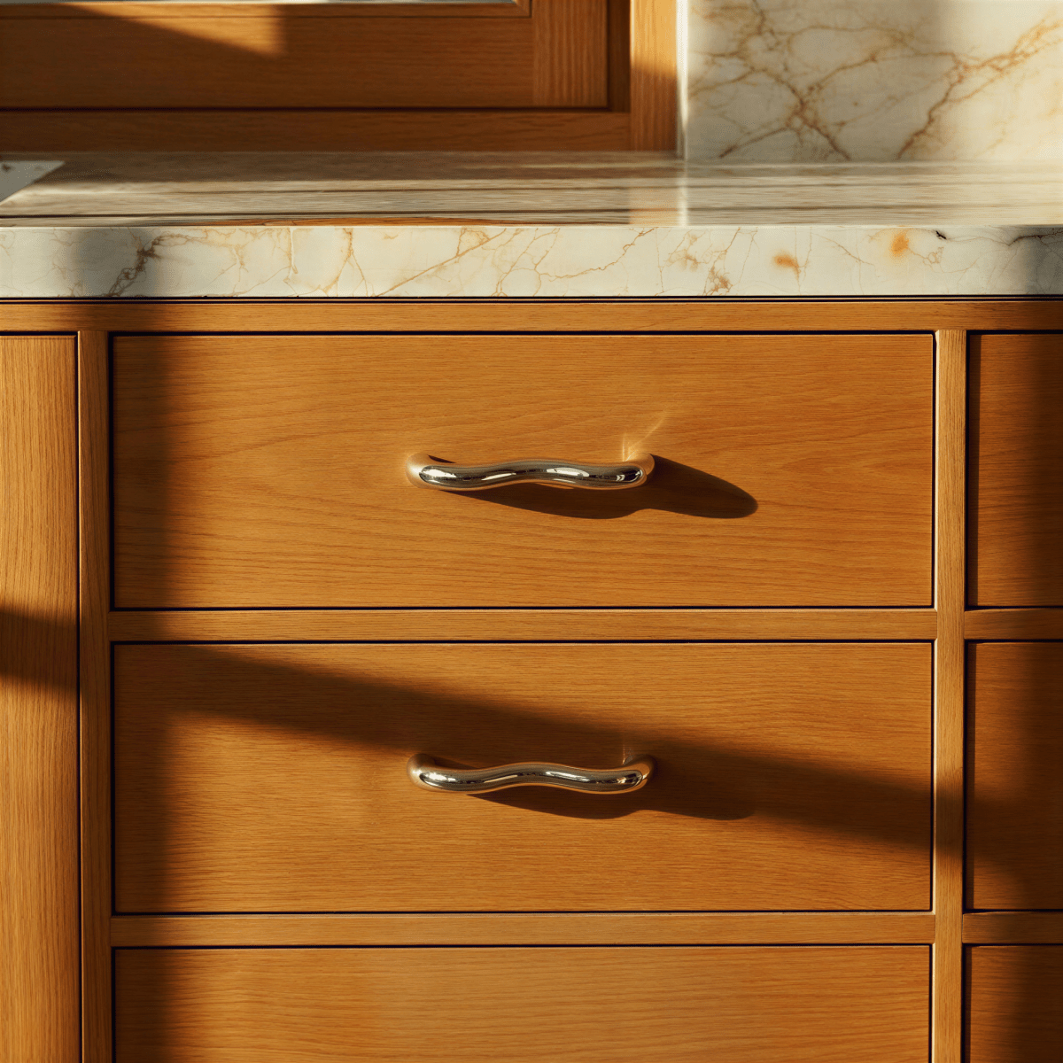 The Ceyro Drawer Pull features a soft, flowing form with a sculptural silhouette. Its curved shape adds a refined, modern accent to cabinetry.