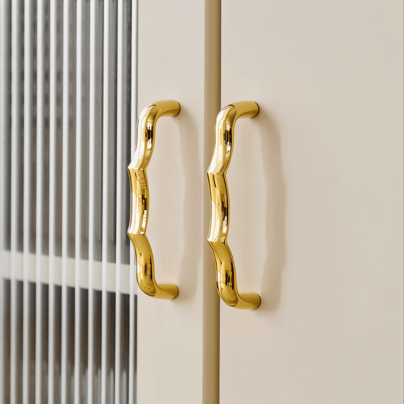 Sculptural solid brass pull bar with fluid curves and polished finish, offering artistic movement, refined grip, and a bold statement for modern cabinetry and wardrobes.