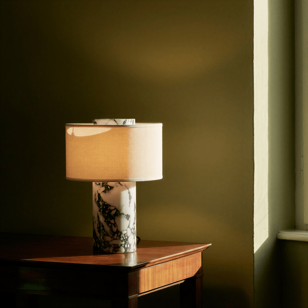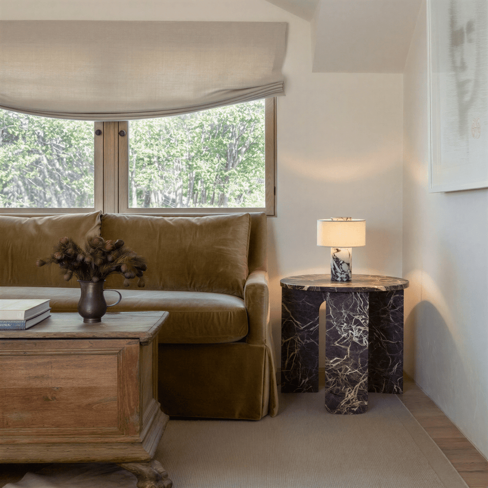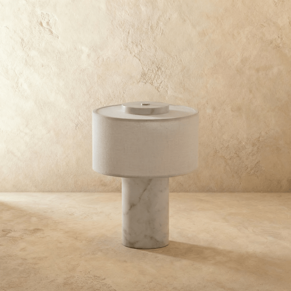 • Natural marble or travertine base with unique stone character • Soft fabric shade creates warm, diffused ambient light • USB-C rechargeable design for cordless placement • Touch dimming control for adjustable lighting • Ideal table lamp for bedside tables, consoles, and reading corners