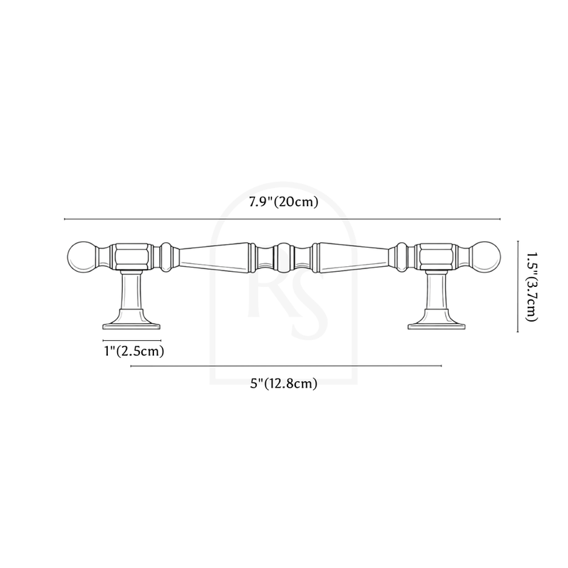 The pull bar includes a cylindrical form with rounded finial ends and a faceted square center detail.