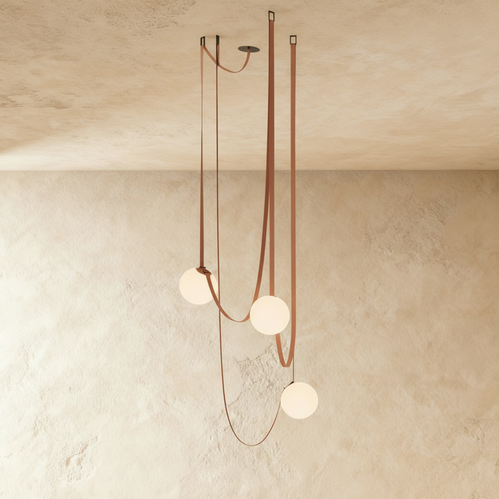 The leather strap on the Corium Leather Glass Chandelier elevates its aesthetic by adding a unique, tactile element that contrasts beautifully with the sleek white glass, creating a sophisticated and stylish focal point in any room. This combination of materials not only enhances the chandelier's visual appeal but also infuses a sense of timeless elegance, making it a perfect addition to halls, parlors, dining rooms, offices, and kitchens.