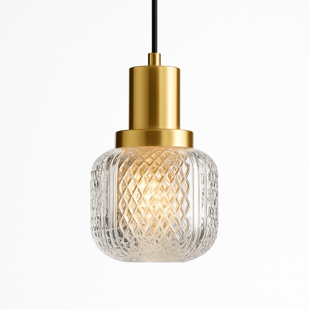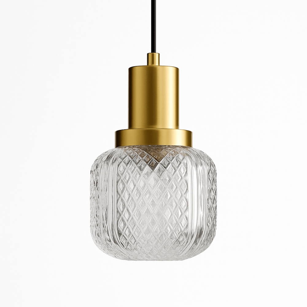 The Crivon pendant light features a luxurious blend of brass and glass, creating an elegant, modern look. The cylindrical brass base pairs seamlessly with a patterned, crystal-clear glass shade, which diffuses light to create a warm, inviting ambiance. The intricate diamond-cut texture on the glass enhances light refraction, adding depth and sophistication. This pendant is ideal for contemporary spaces seeking a touch of classic charm.