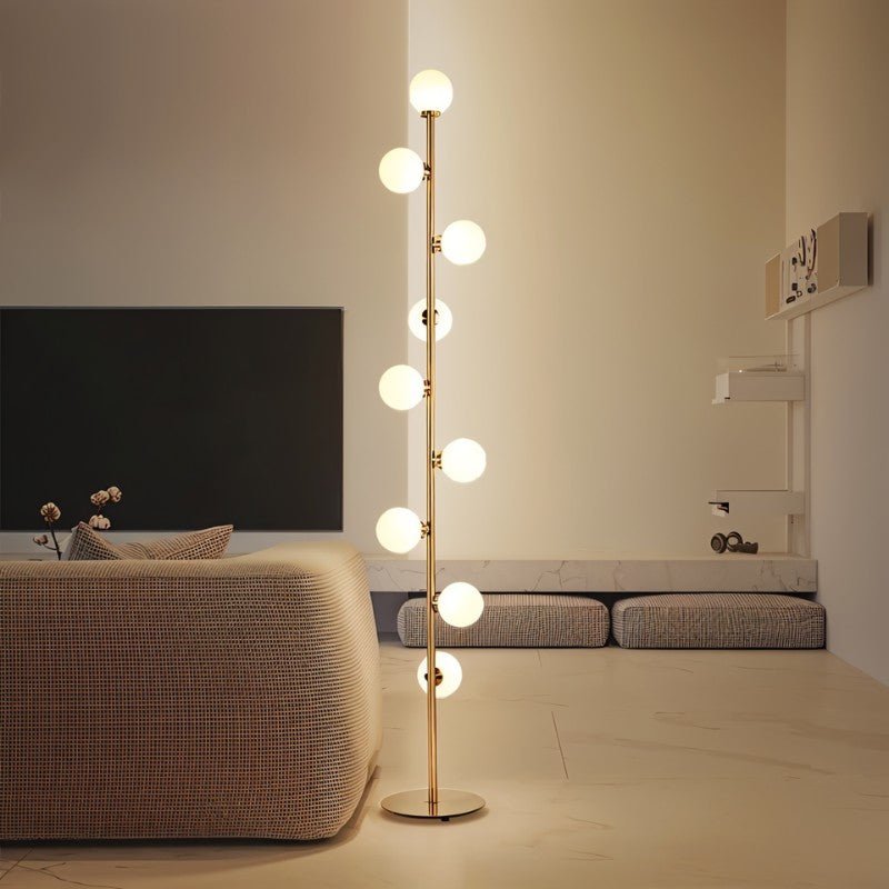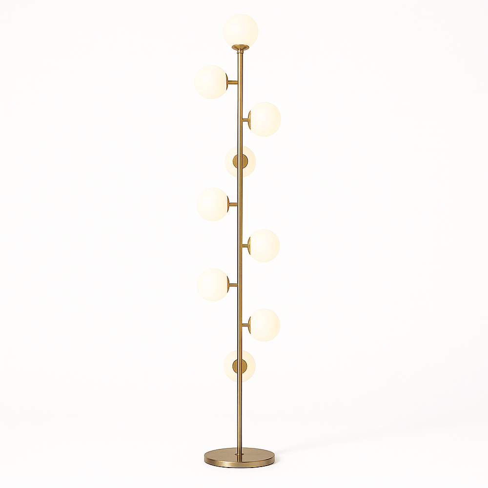 The Domena Floor Lamp features a minimalist vertical design with a sleek polished gold rod and milk-white frosted glass globes, perfectly complementing modern and contemporary interiors. Its elegant structure adds a sophisticated statement to any space without overwhelming the decor.