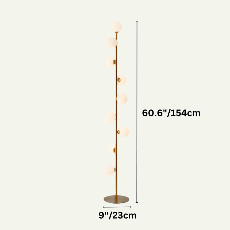 Domena Floor Lamp features milk white frosted glass globes on a sleek metal frame. The vertical rod, finished in polished gold, provides a touch of sophistication and stability. The frosted glass softens the light, creating a warm and inviting glow, perfect for any room. This unique and modern floor lamp would be a striking addition to a living room corner, next to a sofa or armchair, or even in a spacious hallway.
