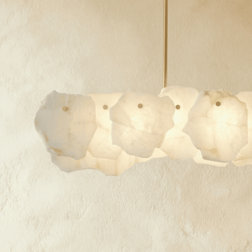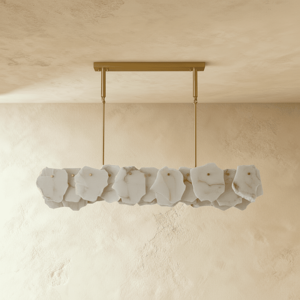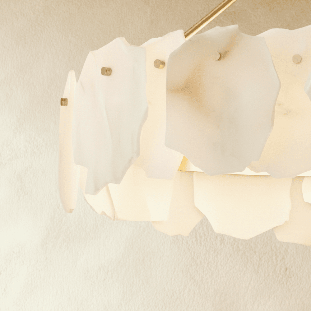 The Elora Chandelier is crafted from premium copper and alabaster. The copper frame lends durability and a warm metallic glow, while the alabaster lampshades provide a natural diffusion of light with their irregular contours.