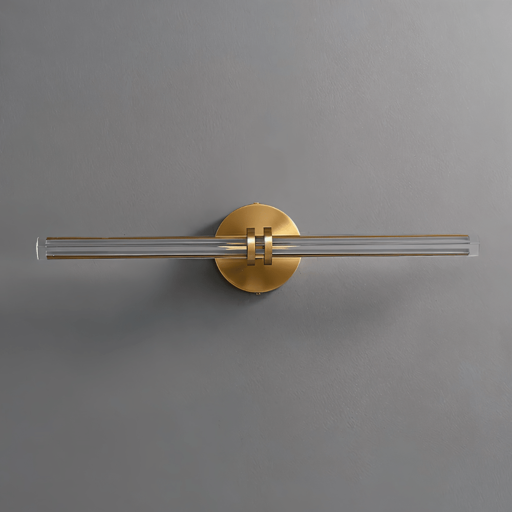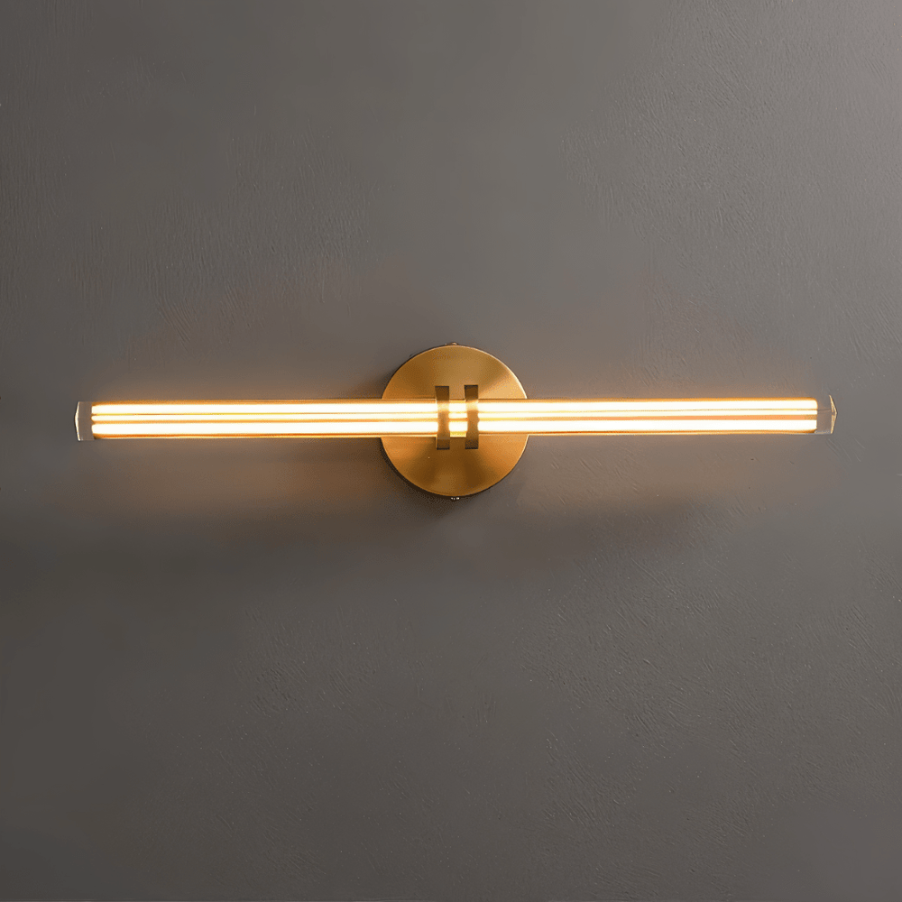 The Elvar Wall Lamp is a refined light fixture crafted from glass and copper, featuring a triangular glass tube that enhances light with subtle prismatic reflections. Its circular copper base anchors the design with modern elegance while the clear glass amplifies the warm metallic finish. Perfect for living rooms, bedrooms, hallways, or bathrooms, this wall-mounted light fixture adds both architectural style and balanced illumination to contemporary interiors.