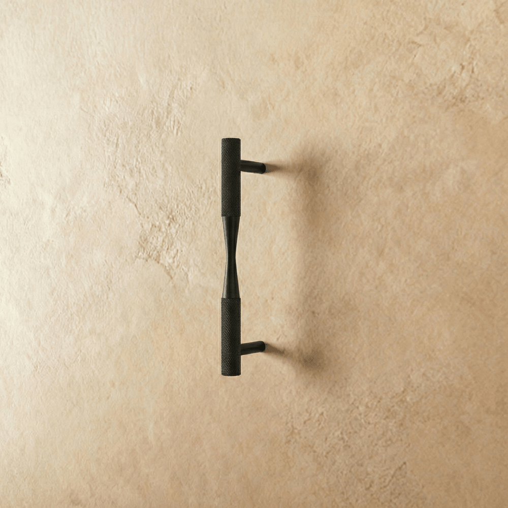The Esnato pull bar is crafted from premium brass, featuring a sleek cylindrical design with knurled detailing that enhances grip and adds a textured aesthetic. The tapered ends seamlessly balance modern elegance with ergonomic functionality, making it ideal for various interior applications. This handle is perfect for kitchen cabinets, wardrobe doors, and drawers, providing durability and a sophisticated look.