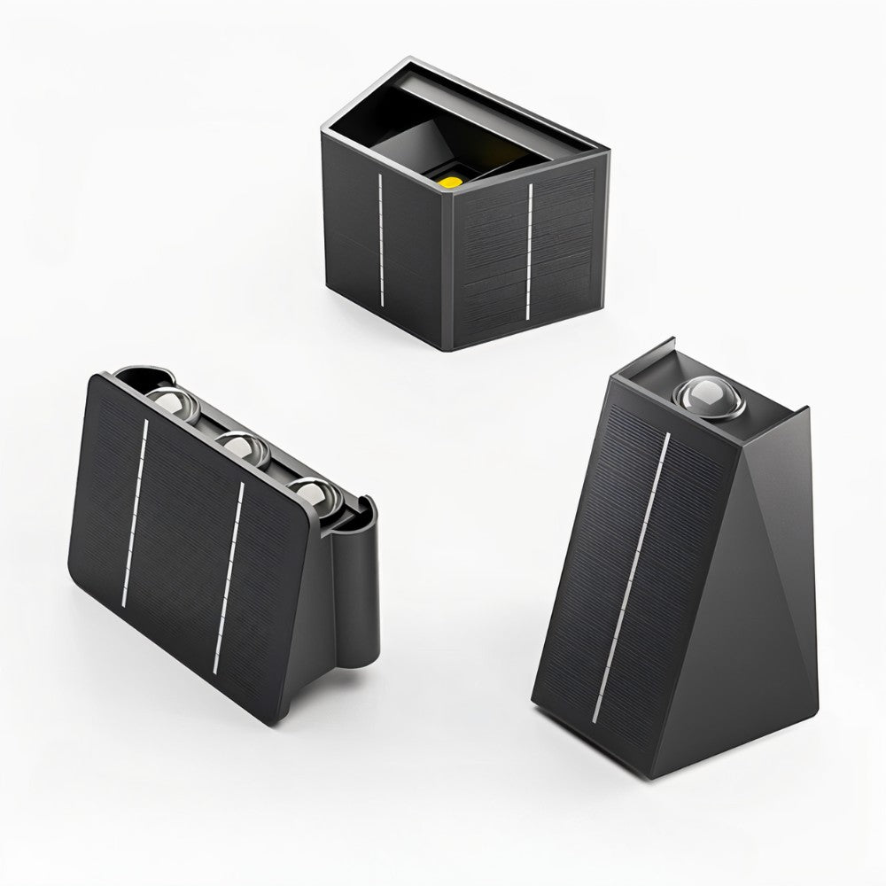 The Exterius Outdoor Wall Lamp enhances outdoor aesthetics with its modern design, illuminating both upward and downward for a unique lighting effect, and using solar power and efficient LEDs for superior brightness and energy efficiency.