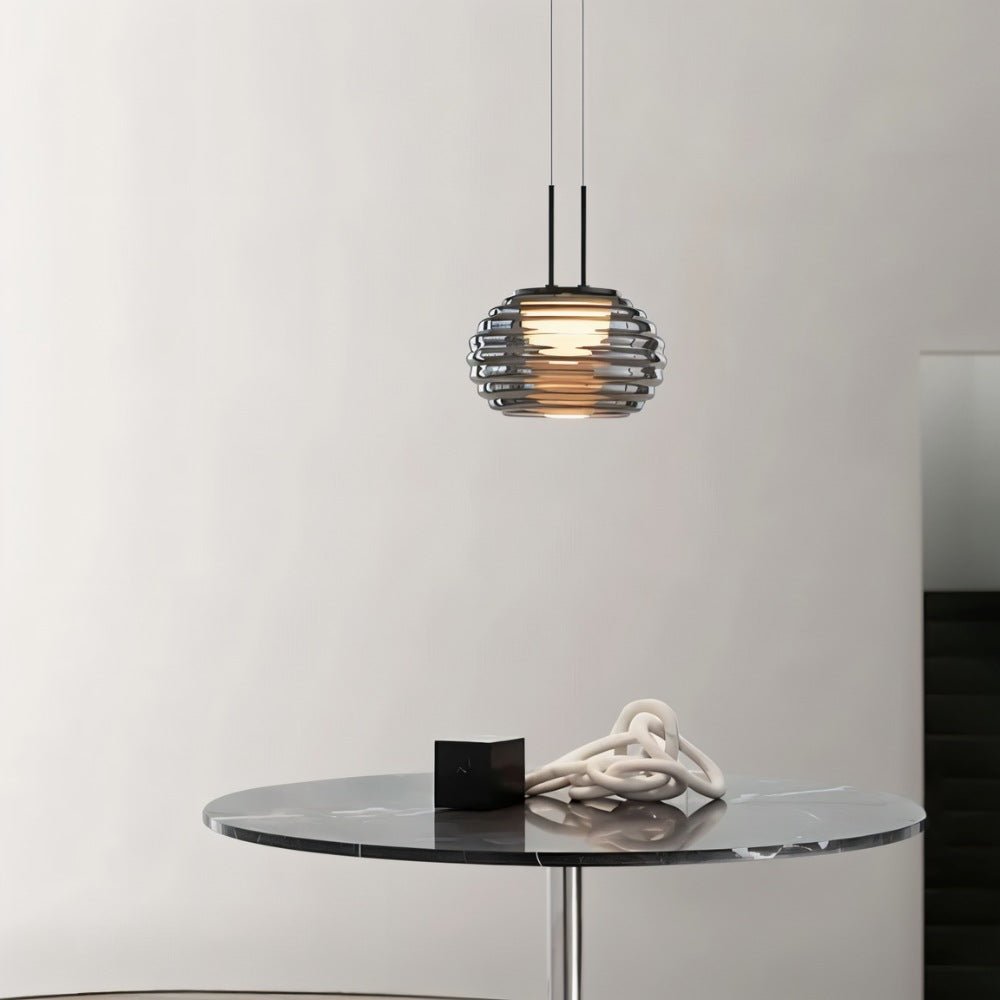 The Filano pendant light features a ribbed glass shade with a sleek iron frame, creating a modern yet timeless design. This light fixture casts a warm, diffused glow, enhancing bedrooms, dining areas, and contemporary interiors. Its compact form makes it perfect for bedside lighting, kitchen islands, or cozy books.