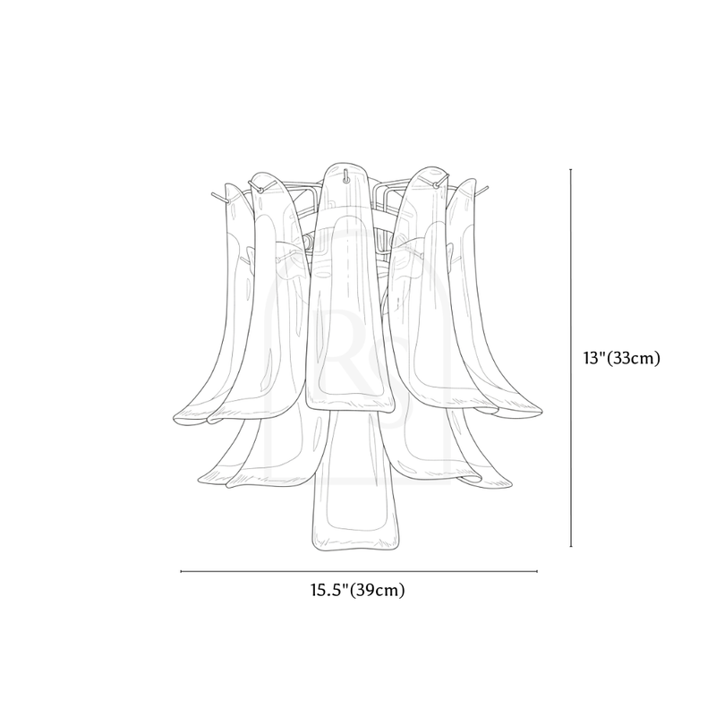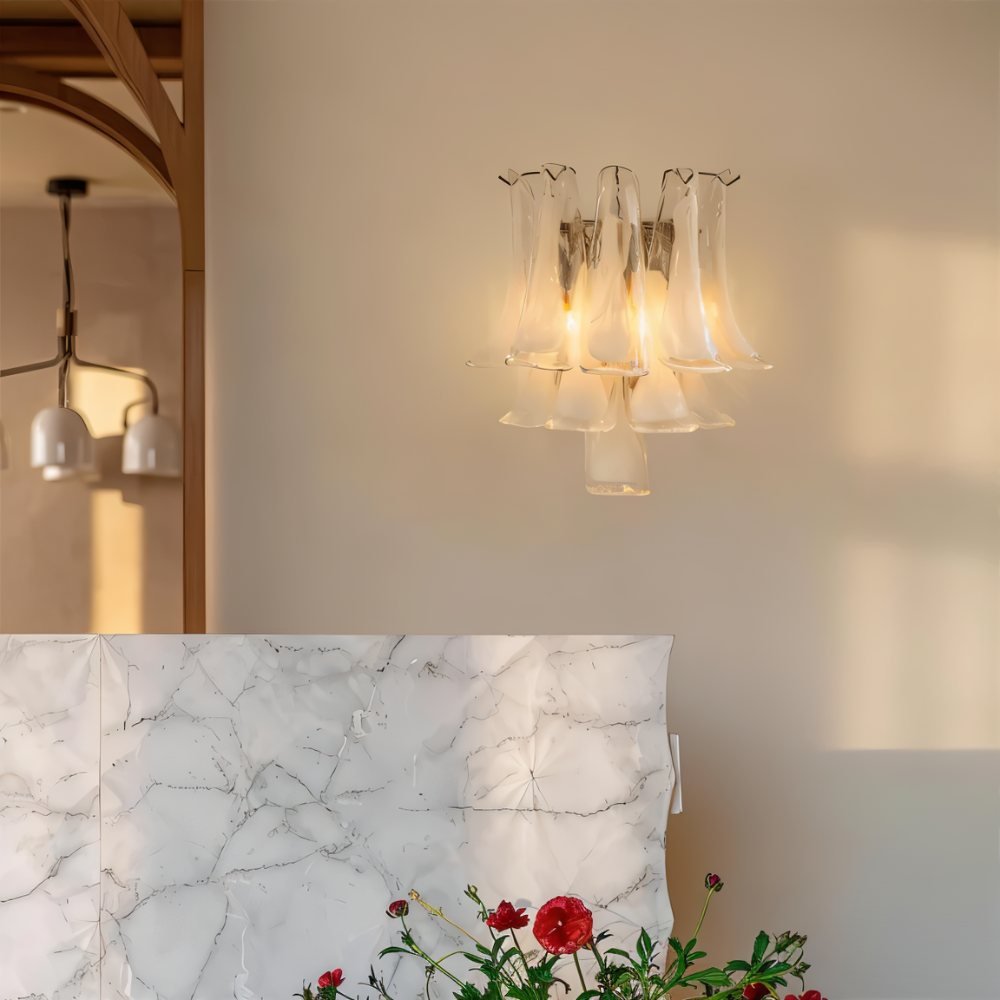 Flares Wall Lamp is an elegant light fixture crafted from iron and glass, designed with layered curved glass pieces that resemble delicate petals. Each glass element diffuses light softly, creating a warm, ambient glow and artistic visual texture. Supported by a polished iron frame, this wall-mounted light fixture adds sculptural sophistication and luminous charm to bedrooms, hallways, and modern living spaces.