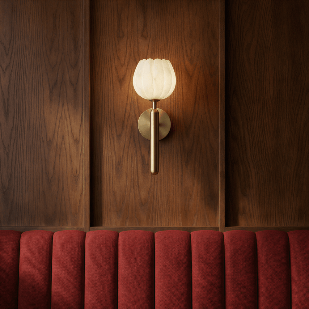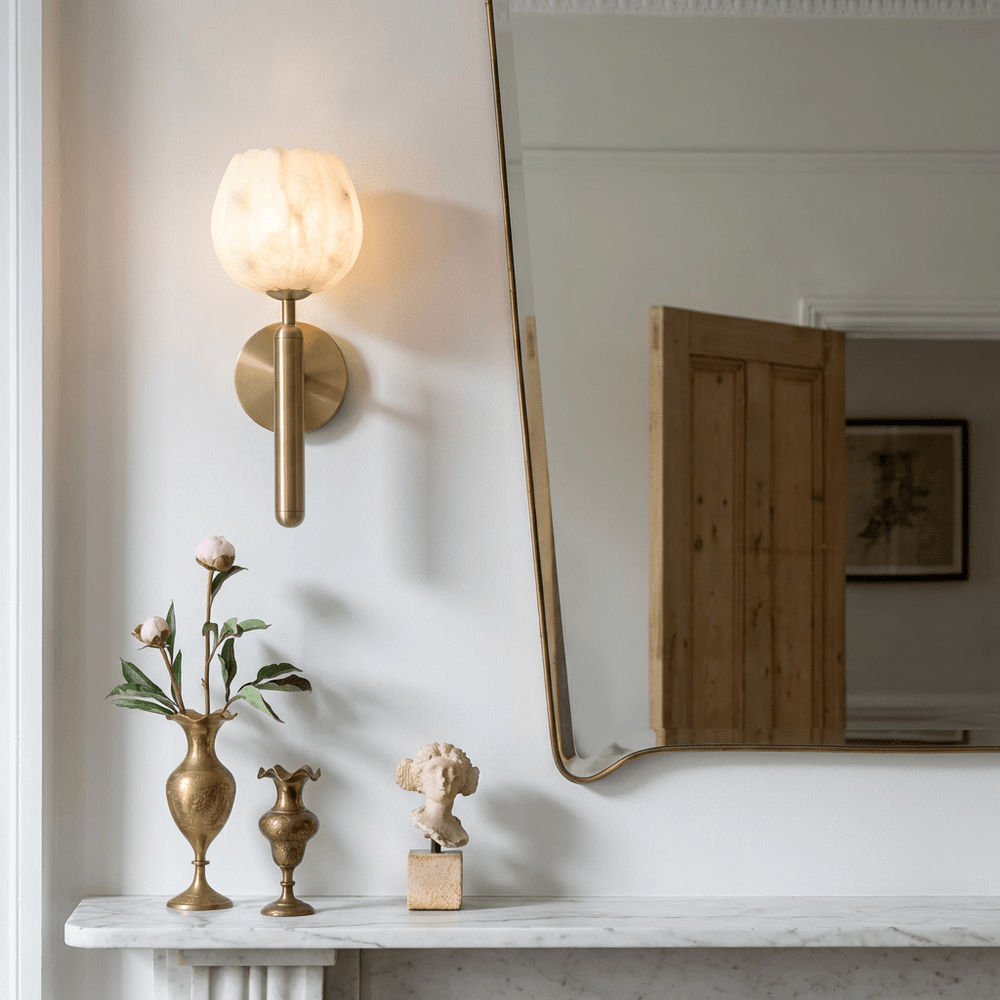 The Flora Alabaster Wall Lamp brings a quiet sculptural presence to the wall. A softly rounded alabaster shade sits above a slender vertical stem and circular backplate, creating a balanced silhouette that feels both refined and architectural. When illuminated, the stone diffuser emits a warm, ambient glow that gently softens the surrounding space.