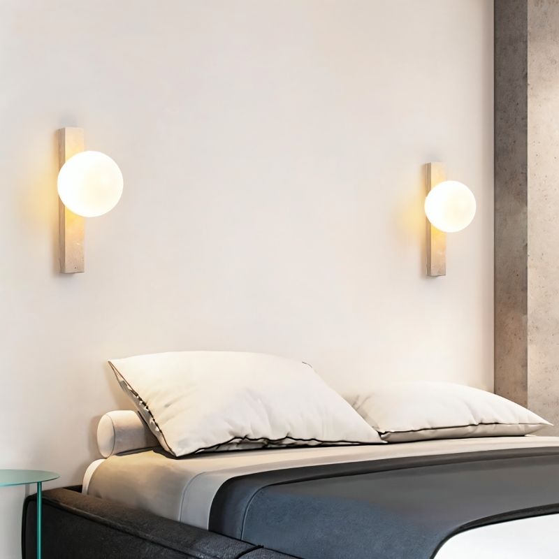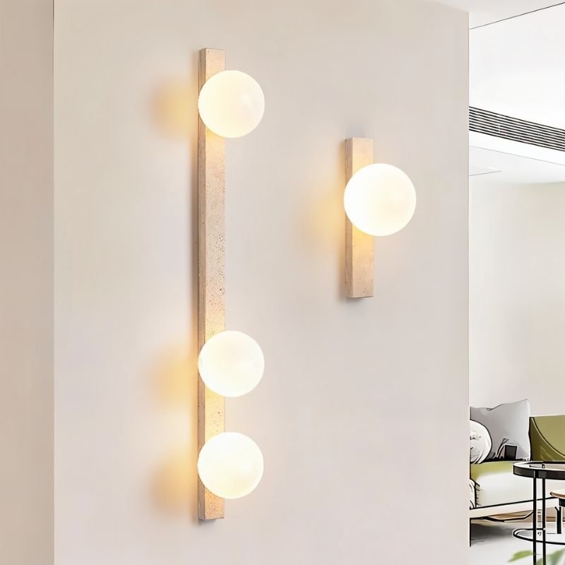 The Fyris Travertine Wall Lamp is a minimalist light fixture crafted from natural travertine and glass, designed to bring elegance to any interior. Its vertical structure features a travertine base with one or multiple frosted glass globes, offering soft, ambient lighting. Ideal for hallways, bedrooms, or living areas, this wall lamp creates a refined atmosphere while blending seamlessly with modern and contemporary interiors.