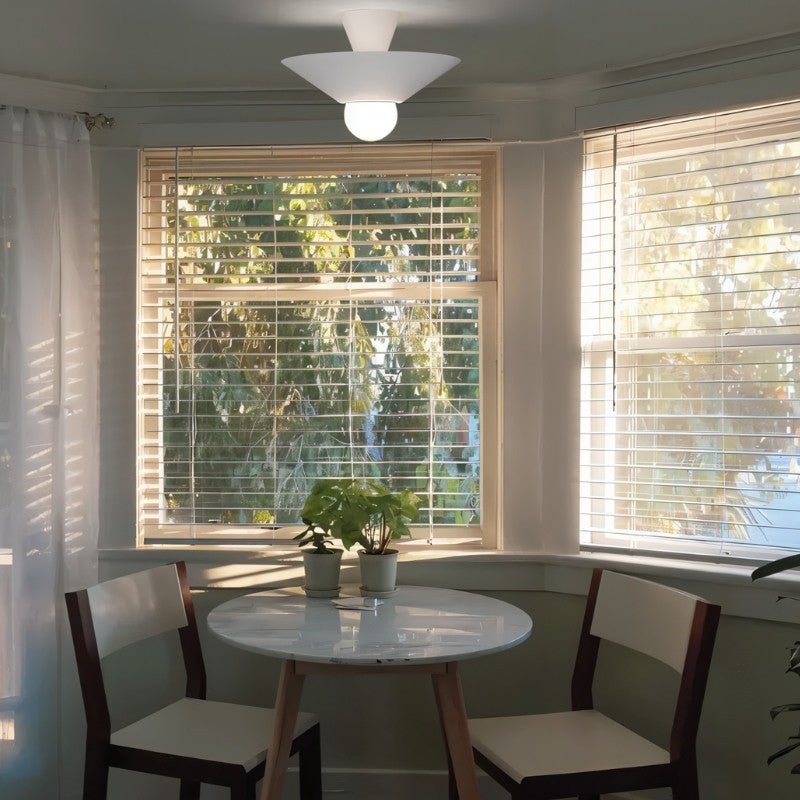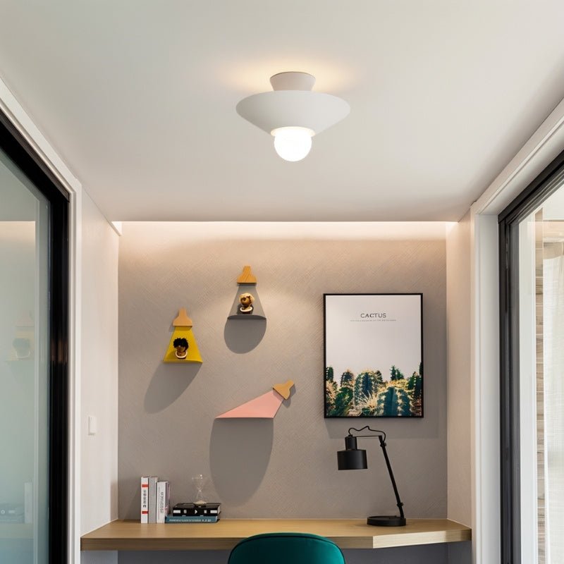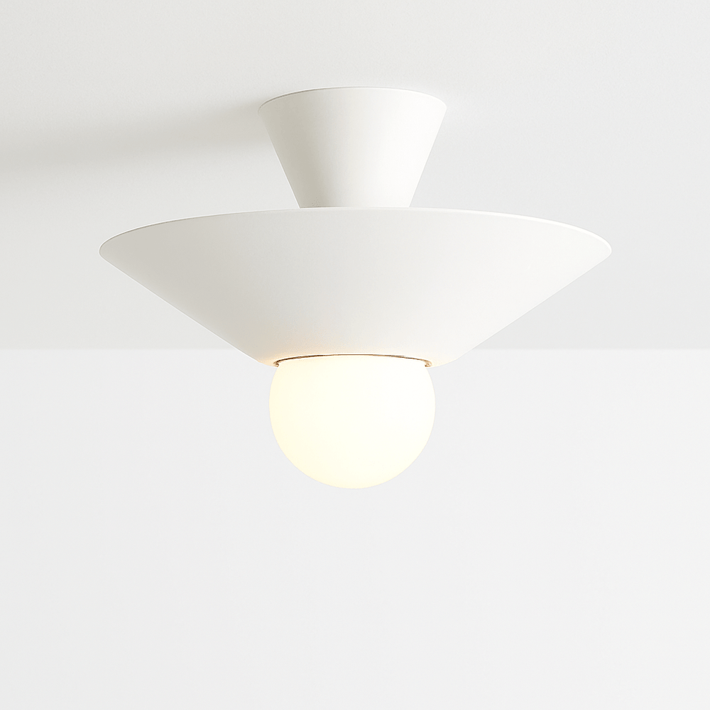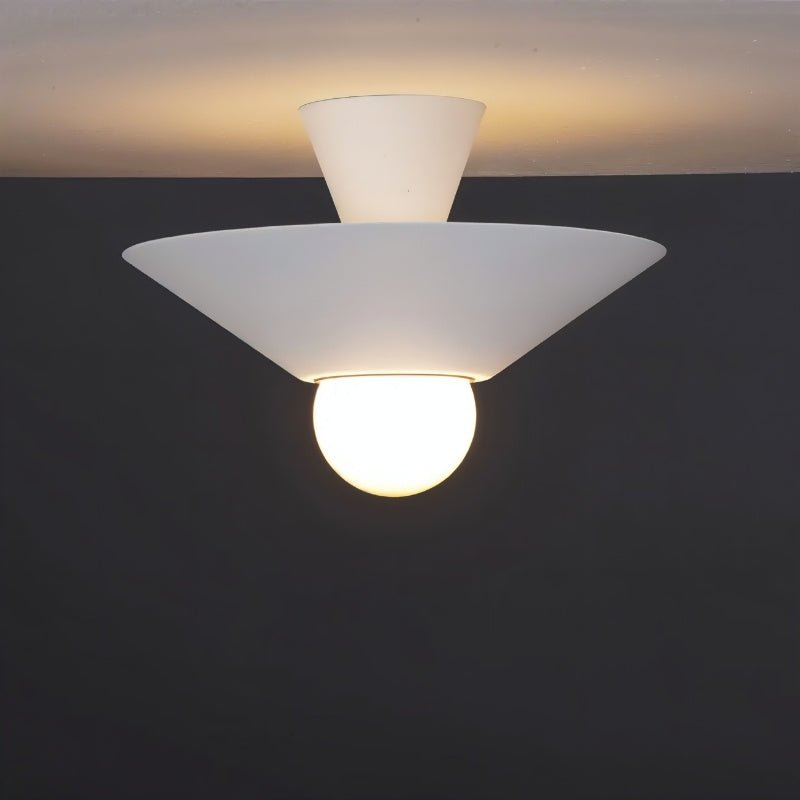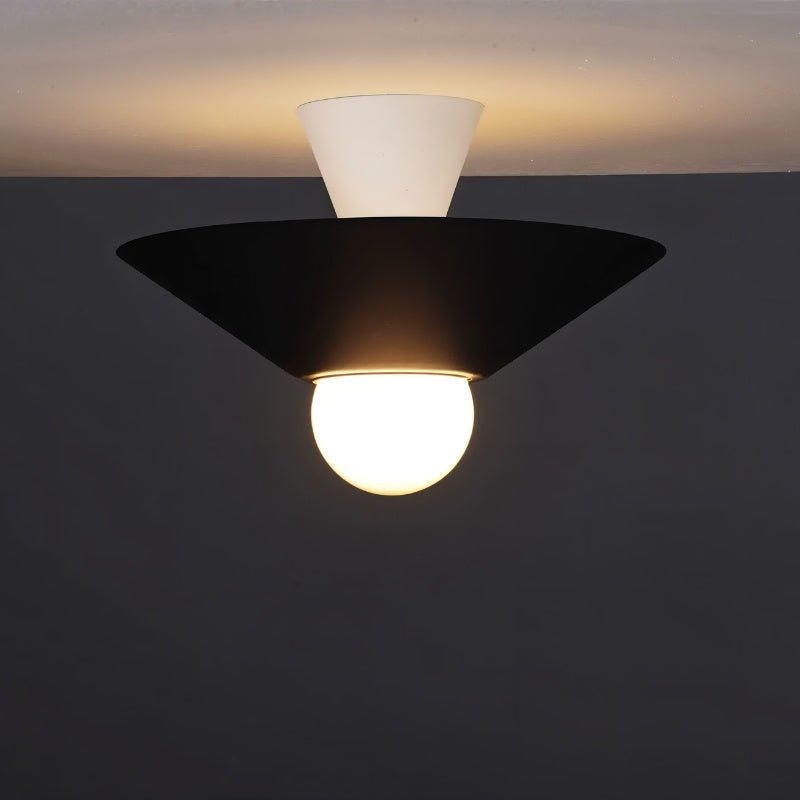The Glome Ceiling Lamp is a modern aluminum light fixture with a unique geometric design, featuring conical elements and a central globe bulb. Its contrasting color options enhance visual appeal, making it ideal for living rooms, bedrooms, hallways, and dining areas. This ceiling light fixture provides ambient lighting while serving as a stylish focal point. Perfect for residential and commercial spaces, it offers a minimalist yet artistic touch to contemporary interiors.