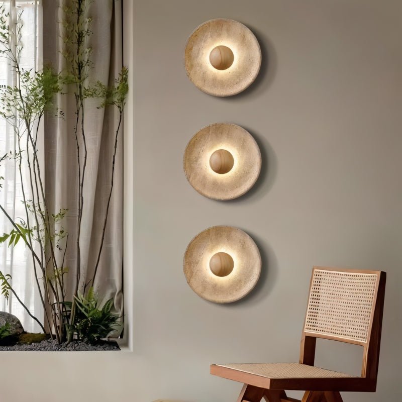 Glova travertine wall lamp is a modern light fixture with a sleek, minimalistic design. It features a circular shape crafted from Yellow Travertine stone, offering an earthy aesthetic, complemented by a walnut-finished wood accent for a striking contrast. The light gently emanates from behind the stone disk, casting a warm glow that highlights the natural textures. Ideal for living rooms, hallways, or bedrooms, this fixture serves as both illumination and a statement piece, blending art and functionality for contemporary interiors.