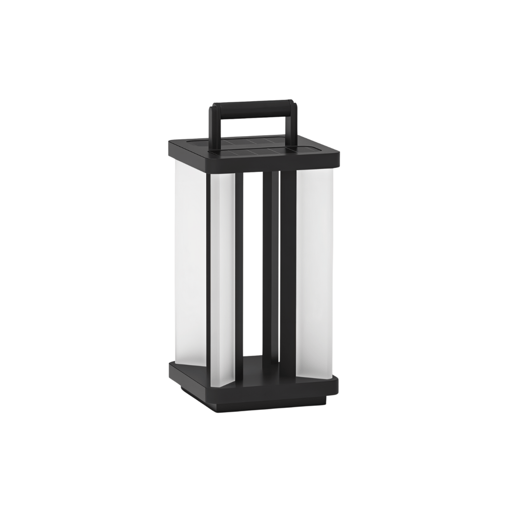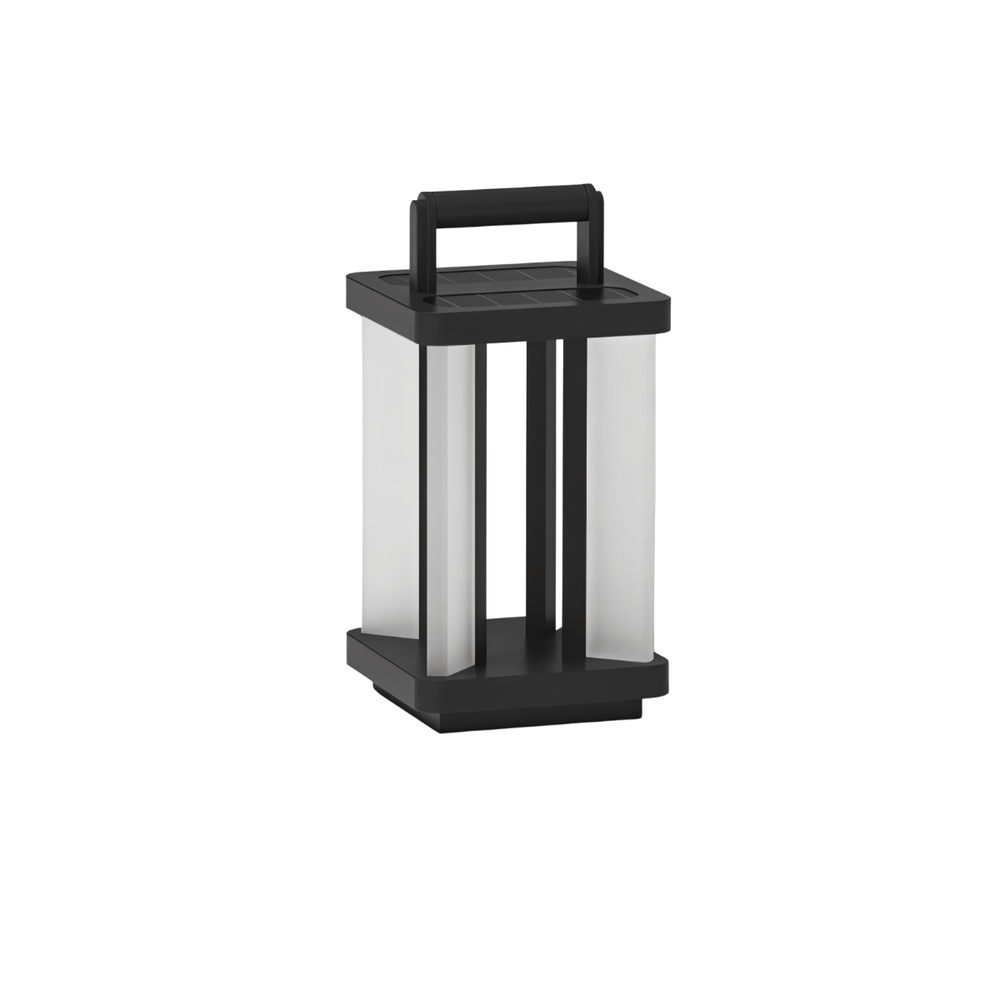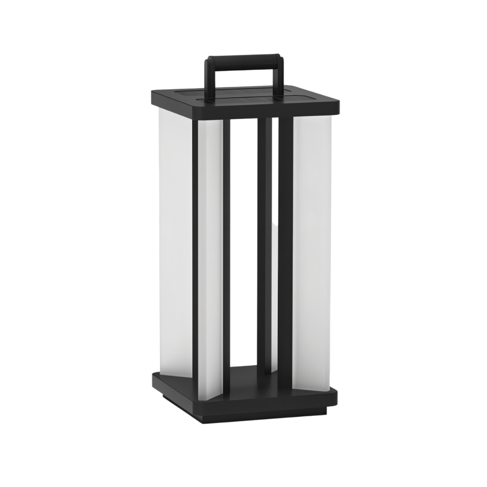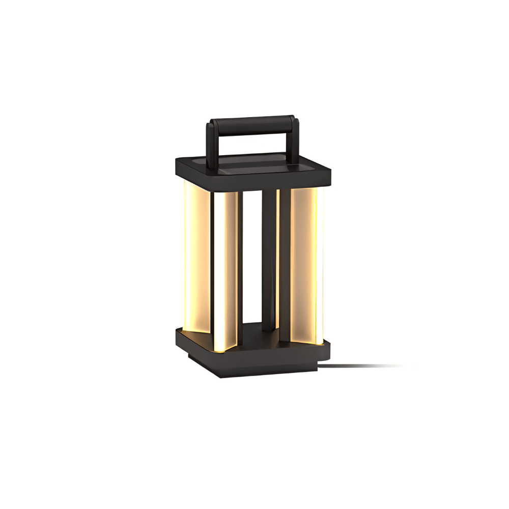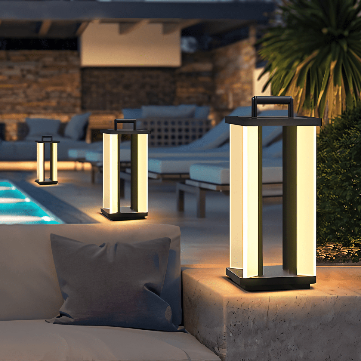A refined geometric frame with vertical light panels creates a modern lantern silhouette that enhances patios, seating areas, and pathways with balanced ambient illumination.