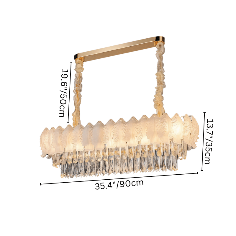 • Draped glass elements diffuse warm lighting, providing a soft, inviting ambiance throughout rooms.