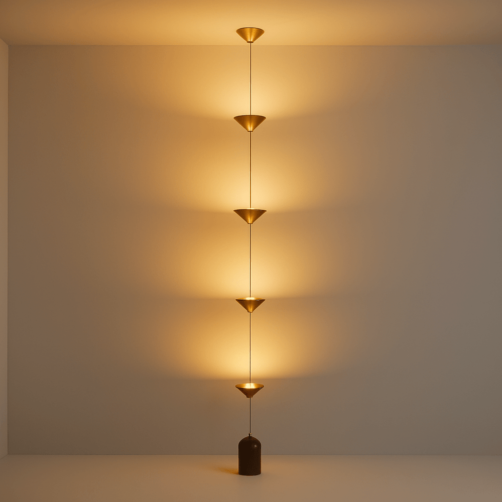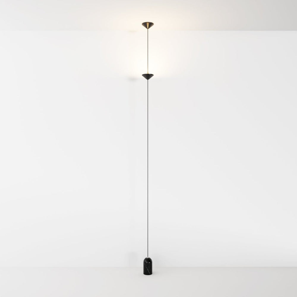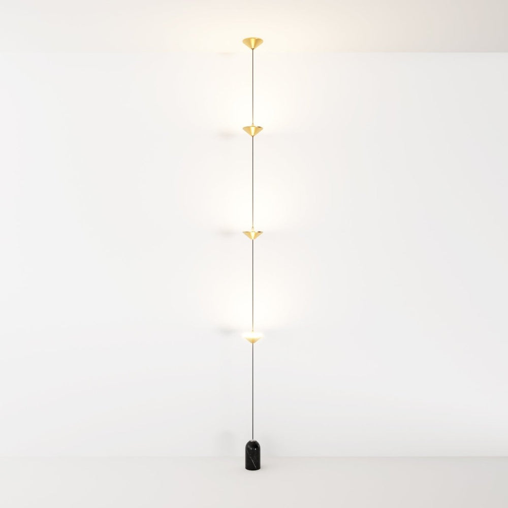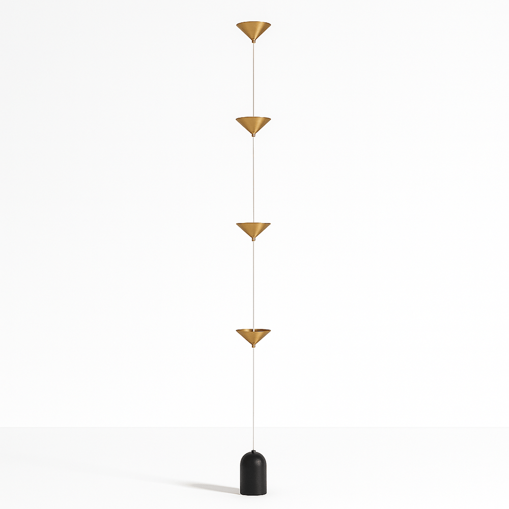 The Keilana Floor Lamp features three elegant conical aluminum shades suspended on a pull cable, finished in matte black or brass gold. A glossy marble counterweight provides stability and visual appeal. Anchored to the ceiling, it boasts strategically placed LEDs along its silhouette, casting a calming, inviting glow. Its modern design and functionality make it the perfect statement piece for any space.