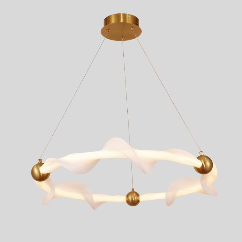 The Kyria Chandelier is a sculptural light fixture made from metal and fabric, featuring fluid, wave-like rings suspended by delicate cables. Gold-finished spheres accentuate its dynamic form, creating a striking focal point. Designed for dining rooms, living spaces, and high-ceilinged entryways, it diffuses light softly for an elegant glow. This statement piece enhances modern, minimalist, and artistic interiors in both residential and boutique commercial spaces.