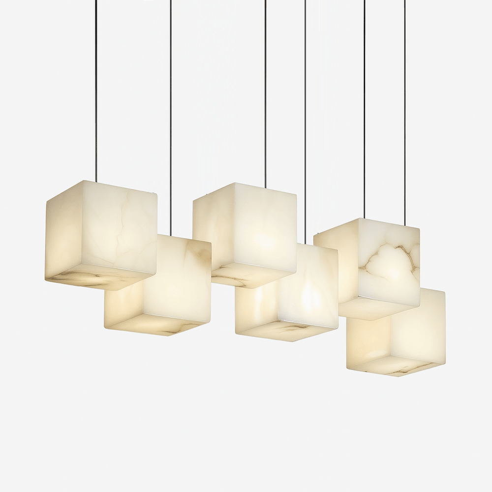 This pendant is perfect for dining tables and kitchen islands. Its cubic design adds a radiant focal point to your space. The alabaster shade, with a pearl-like sheen, can be customized in different quantities, providing pure and eye-catching illumination, and enhancing both aesthetics and functionality in your home.