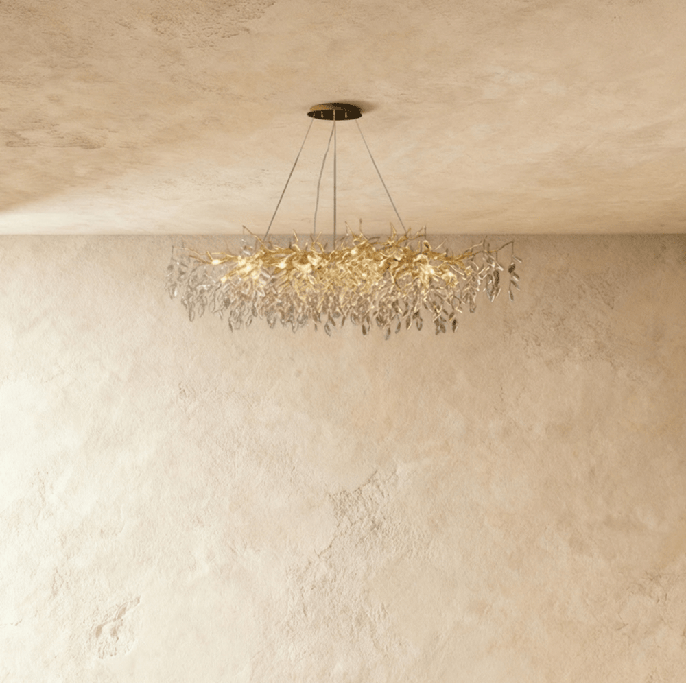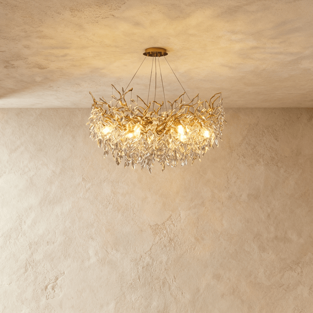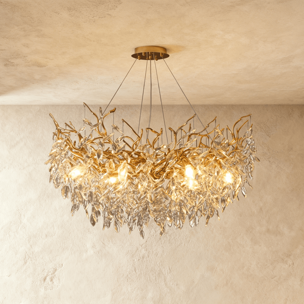 Golden gloss finish and crystal design provide a soft, ambient glow — perfect for dining rooms seeking modern elegance and enduring sophistication.