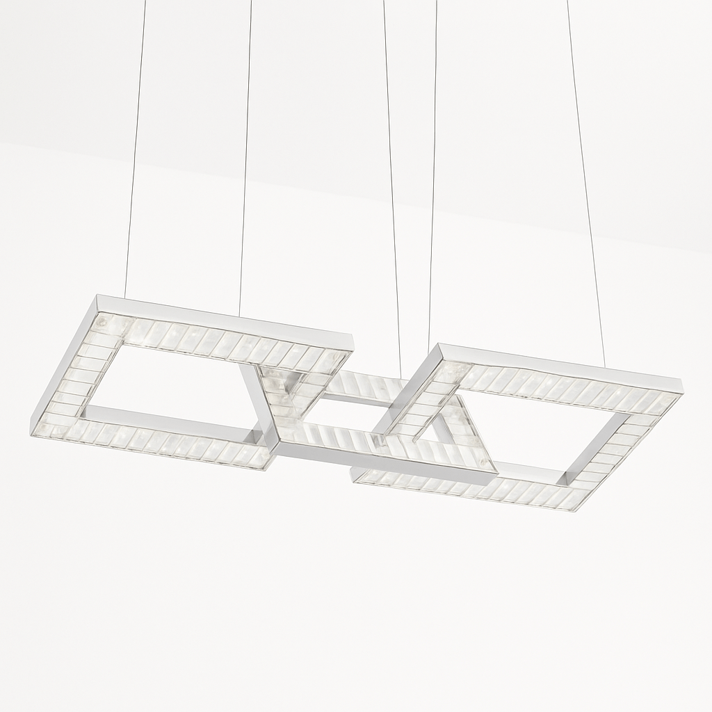 The Lanac Chandelier blends grandeur with modern design, featuring interlocking crystal-covered rectangular frames. Crafted from high-quality metal with gold-plated and chrome finishes, it sparkles from every angle. Ideal for offices, living rooms, dining areas, and more, this chandelier adds an exotic touch of elegance and refinement to any space. Perfect for both private and public environments.