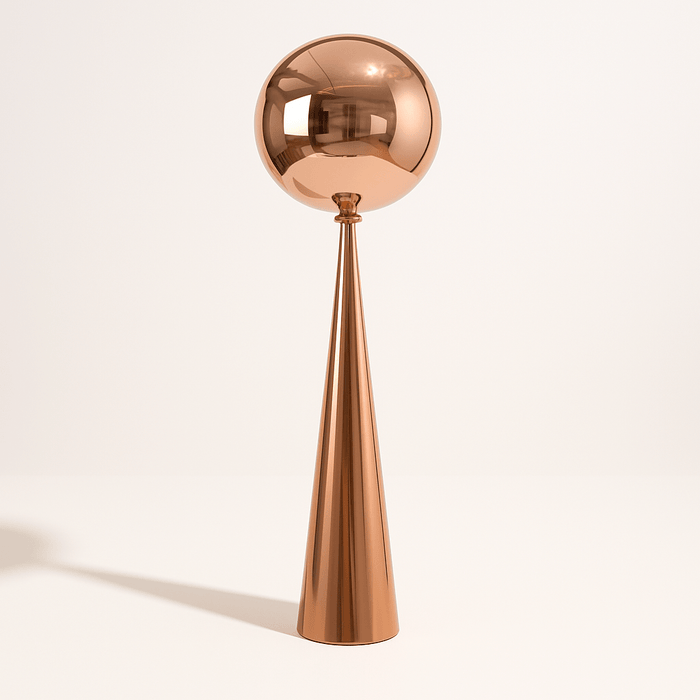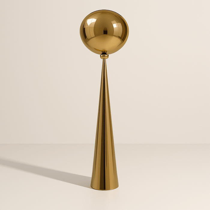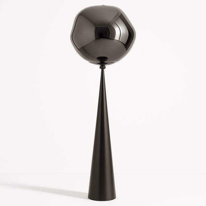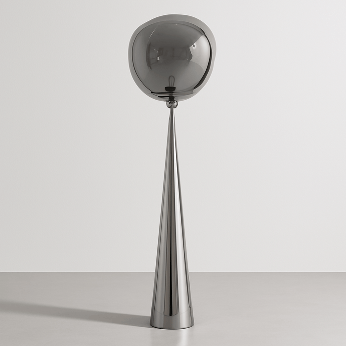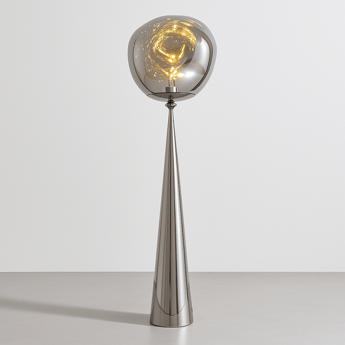 The Lava Floor Lamp features a beautifully distorted glass lampshade and a conical stainless steel body, blending art and functionality. When on, it creates an ethereal hot-blown glass effect; when off, it offers a sleek mirror finish. Available in metallic hues, it adds drama and luminosity to any space. Perfect for a living room or hallway, it pairs beautifully with an armchair for ultimate tranquility. This statement lamp elevates any corner with its contemporary design and captivating glow.